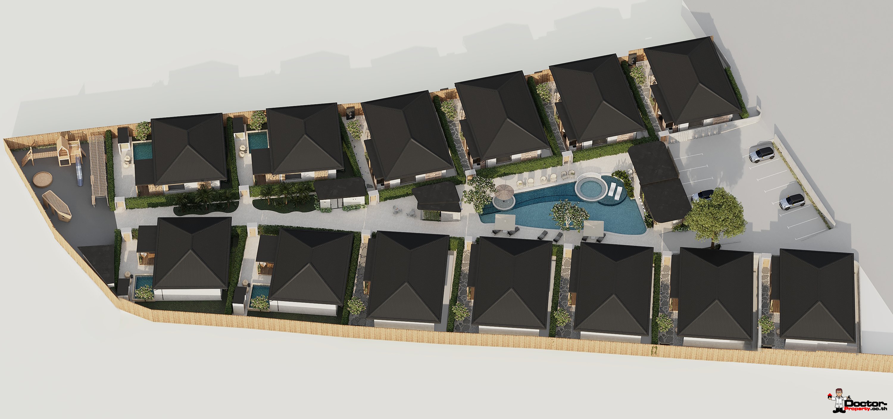 Diese exklusive Anlage umfasst insgesamt 13 Villen, die sorgfältig entworfen wurden, um Privatsphäre, Komfort und modernen Stil zu vereinen. Käufer können zwischen zwei verschiedenen Grundrissen wählen: einer Villa mit zwei Schlafzimmern, 2,5 Bädern und privatem Pool oder einer Villa mit drei Schlafzimmern und 3,5 Bädern, die ohne Pool, aber mit großzügigem Wohnraum konzipiert ist. Von den 13 Residenzen sind vier Einheiten als Poolvillen mit zwei Schlafzimmern und neun Einheiten als Drei-Schlafzimmer-Villen konzipiert. Jede Villa wird komplett möbliert übergeben und besticht durch eine moderne Ästhetik mit klaren architektonischen Linien, hochwertiger Ausstattung und offenen Wohnbereichen, die Innen- und Außenbereiche nahtlos miteinander verbinden. Das Projekt liegt auf einem privaten Anwesen und bietet eine sichere und ruhige Umgebung, ideal sowohl für einen dauerhaften Wohnsitz als auch für einen Urlaub.