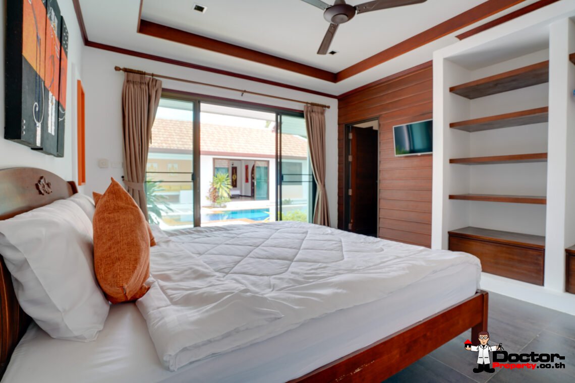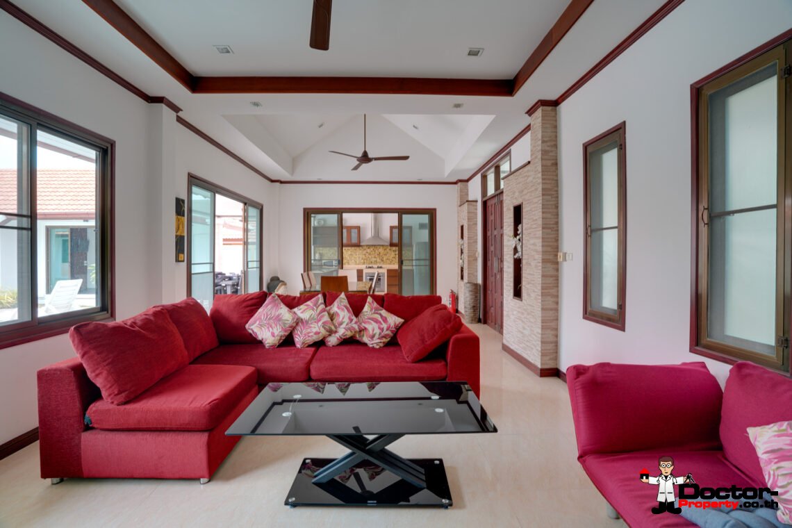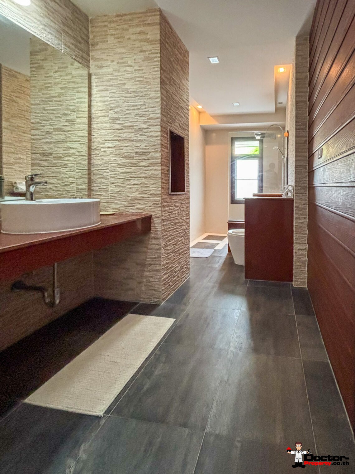 Die Villa ist vollständig möbliert und verfügt über eine westliche Küche, begehbare Kleiderschränke und Flachbildfernseher, sodass sie sofort bezugsfertig ist. Obwohl die Immobilie gut gepflegt ist, würde sie von einigen Aktualisierungen profitieren, um den moderneren Geschmack anzusprechen. Eine Auffrischung der Dekoration und kleinere Verbesserungen könnten ihren Reiz erheblich steigern, was sie sowohl für den persönlichen Gebrauch als auch für Mietzwecke attraktiver machen würde. Der Außenbereich umfasst einen privaten Pool und einen Garten, ideal für entspanntes Leben im Freien, mit bequemem Zugang von mehreren Zimmern.