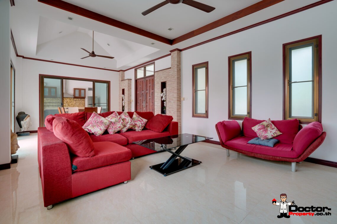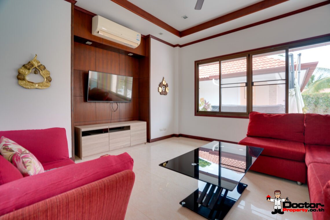 Diese Villa im traditionellen Stil mit 3 Schlafzimmern befindet sich in einer etablierten Wohnanlage im Bang Rak Gebiet von Koh Samui und bietet eine sichere und ruhige Wohnumgebung. Die Immobilie liegt in einer geschlossenen Anlage mit 24/7-Sicherheitsdienst, was Privatsphäre und Sicherheit gewährleistet. Alle Schlafzimmer sind mit eigenen Badezimmern und Klimaanlage ausgestattet, während die Master-Suite über ein angrenzendes Zimmer verfügt, das problemlos in ein weiteres Schlafzimmer mit eigenem Bad umgewandelt werden kann, was Flexibilität für Familien oder Gäste bietet.