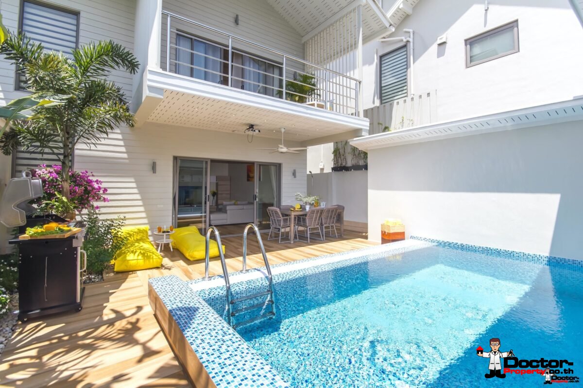 Wenn Sie diese neue Villa betreten, werden Sie sofort die einzigartige Note bemerken – eine separate, voll ausgestattete Küche gegenüber dem Pool des Hauptgebäudes. Der Pool selbst ist mit chlorfrei gefiltertem Wasser. Hier finden Sie alles, was Sie für Ihre Freizeit benötigen: große Sonnenliegen, einen kleinen grünen Garten, gemütliche Partykissen, einen großen Tisch und einen Grill. Ebenfalls gibt es ein Open-Air-Kino mit Projektionsleinwand im Freien, auf dem Sie Filme aus dem Esszimmer ansehen können. Wenn Sie die hohen Türen des Hauptgebäudes aufschieben, werden Sie vom Wohnzimmer und einem schönen modernen gelben Raum begrüßt. Die Party-Sofas in den Ecken und ein Fernseher, die Klimaanlage und das Gästebad sorgen dafür, dass Sie Ihre Zeit mit Freunden so angenehm wie möglich verbringen können! Alle 3 Schlafzimmer haben die gleiche Einrichtung und Aufteilung, so dass es wirklich kein Hauptschlafzimmer gibt, außer dem kleinen Unterschied mit der Terrasse und Blick auf den Pool. In dieser Villa können problemlos mehr als 7 Personen mit Zustellbetten untergebracht werden. Es gibt genügend Platz, um jede Person mit Komfort unterzubringen.