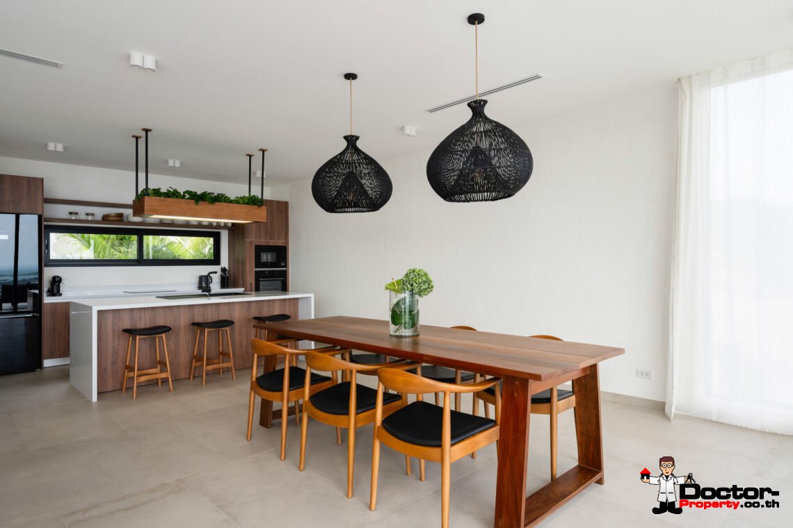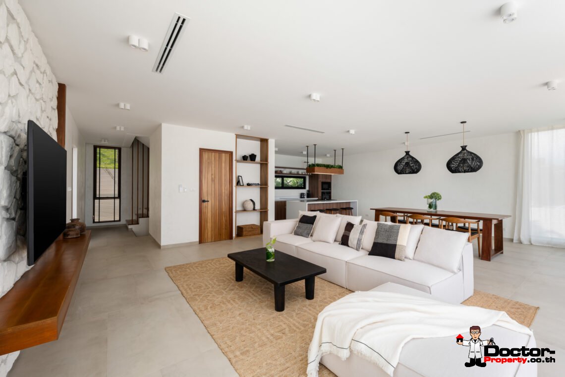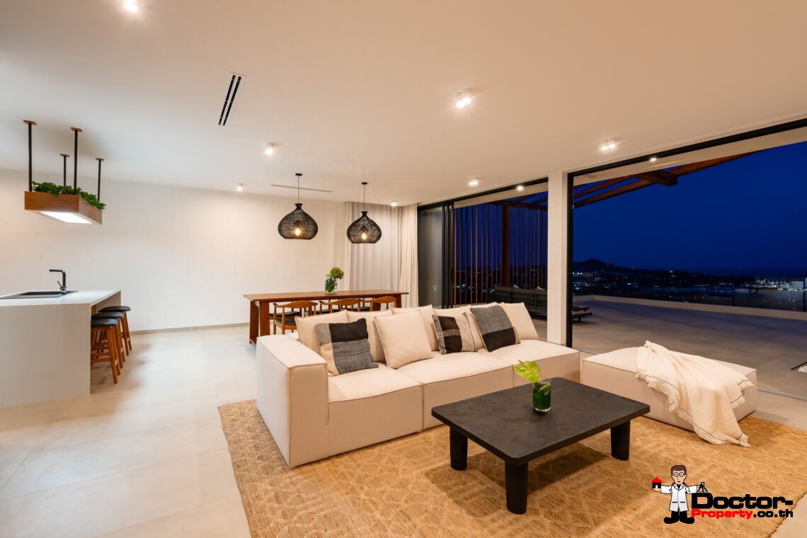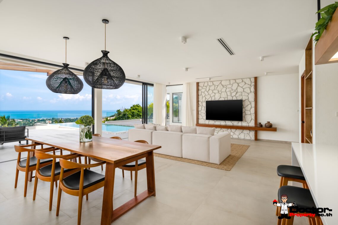 Der offene Wohn- und Küchenbereich ist eine harmonische Mischung aus zeitgenössischer Eleganz und Funktionalität, entworfen, um maximales natürliches Licht und atemberaubende Ausblicke zu bieten. Der Wohnbereich verfügt über ein gemütliches L-förmiges Sofa, eine mit Steinakzenten versehene Wand mit einem montierten Flachbildfernseher und bodentiefe Glasschiebetüren, die sich zur Terrasse und zum Infinity-Pool öffnen und ein nahtloses Wohnen zwischen Innen- und Außenbereich ermöglichen. Die moderne Küche bietet eine elegante Insel mit einer weißen Arbeitsplatte, Holzschränke und eingebaute Geräte, ergänzt durch einen stilvollen Essbereich mit einem handgefertigten Holztisch und auffälligen schwarzen Pendelleuchten. Dieser Raum ist perfekt zum Entspannen, Unterhalten und Genießen der atemberaubenden Umgebung von Chaweng.
