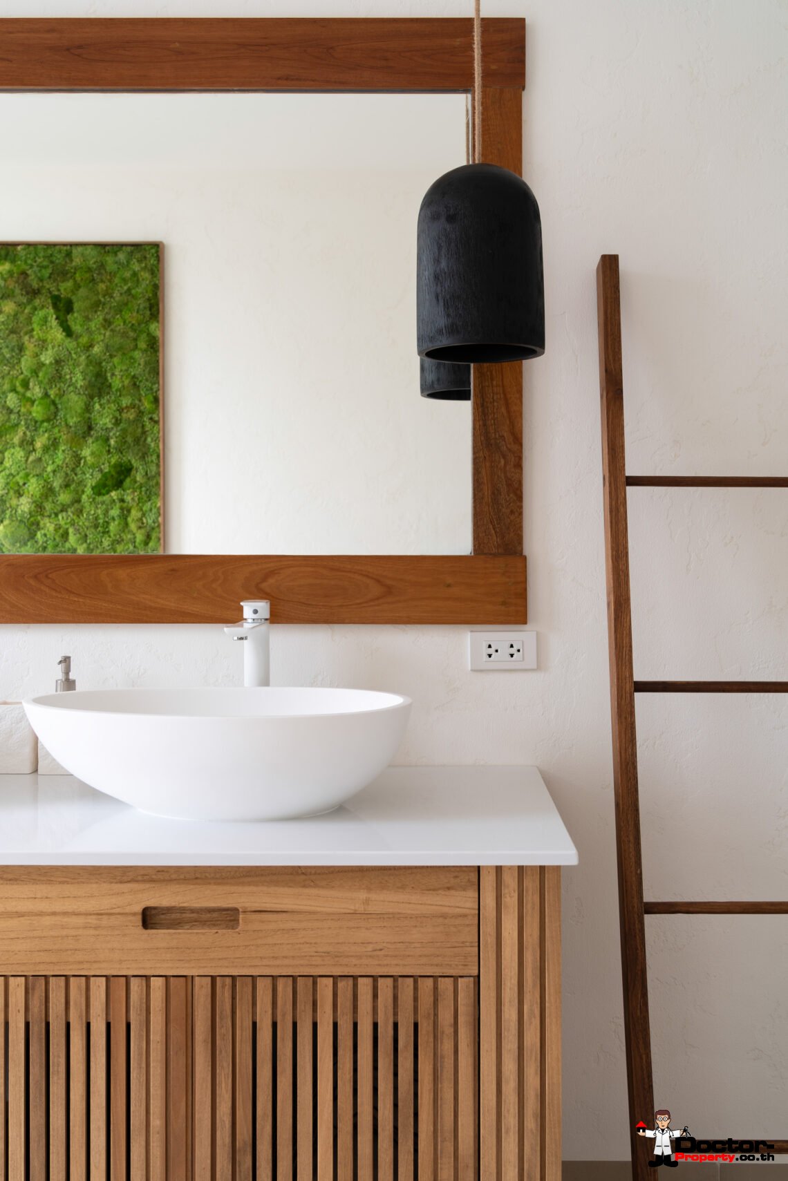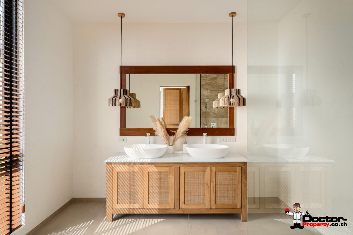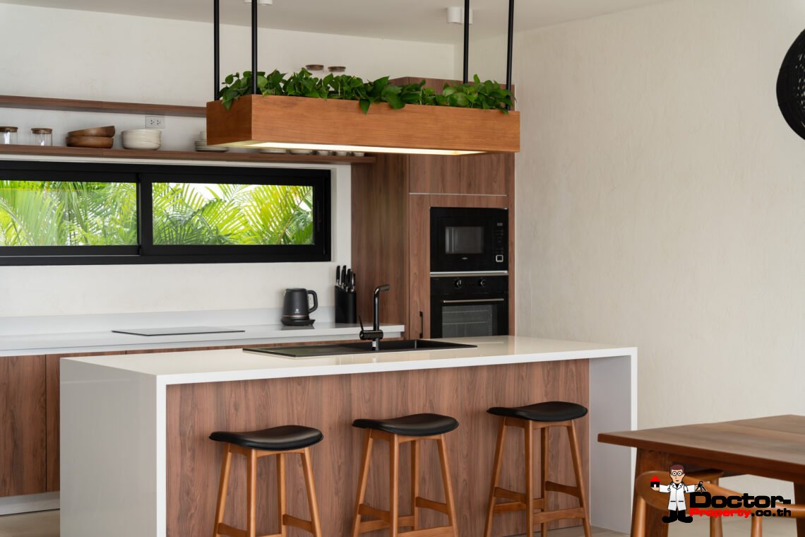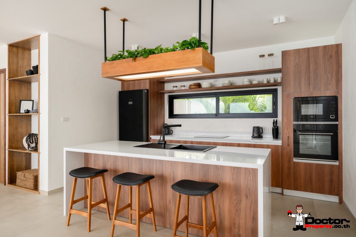 Der offene Wohn- und Küchenbereich ist eine harmonische Mischung aus zeitgenössischer Eleganz und Funktionalität, entworfen, um maximales natürliches Licht und atemberaubende Ausblicke zu bieten. Der Wohnbereich verfügt über ein gemütliches L-förmiges Sofa, eine mit Steinakzenten versehene Wand mit einem montierten Flachbildfernseher und bodentiefe Glasschiebetüren, die sich zur Terrasse und zum Infinity-Pool öffnen und ein nahtloses Wohnen zwischen Innen- und Außenbereich ermöglichen. Die moderne Küche bietet eine elegante Insel mit einer weißen Arbeitsplatte, Holzschränke und eingebaute Geräte, ergänzt durch einen stilvollen Essbereich mit einem handgefertigten Holztisch und auffälligen schwarzen Pendelleuchten. Dieser Raum ist perfekt zum Entspannen, Unterhalten und Genießen der atemberaubenden Umgebung von Chaweng.