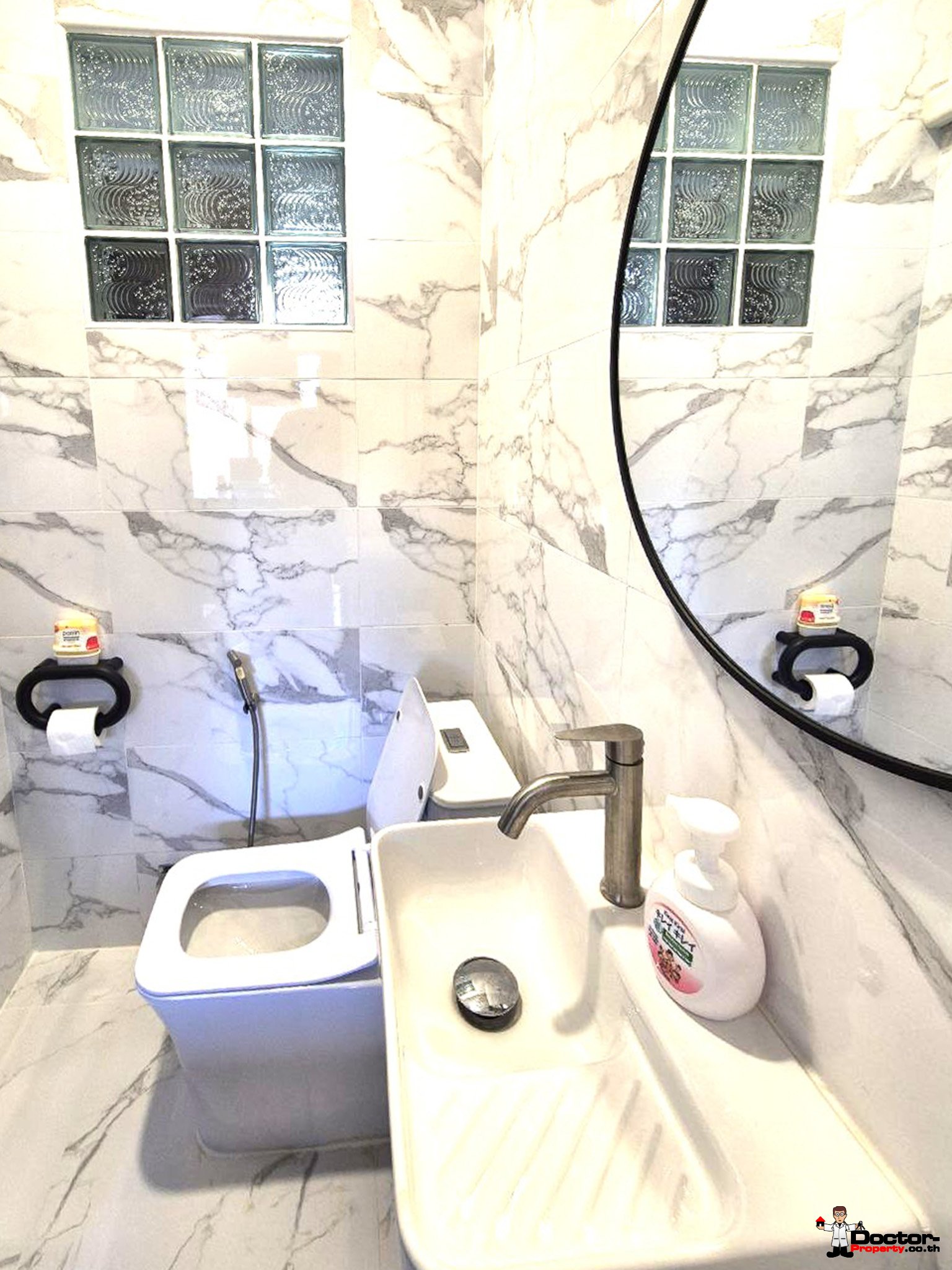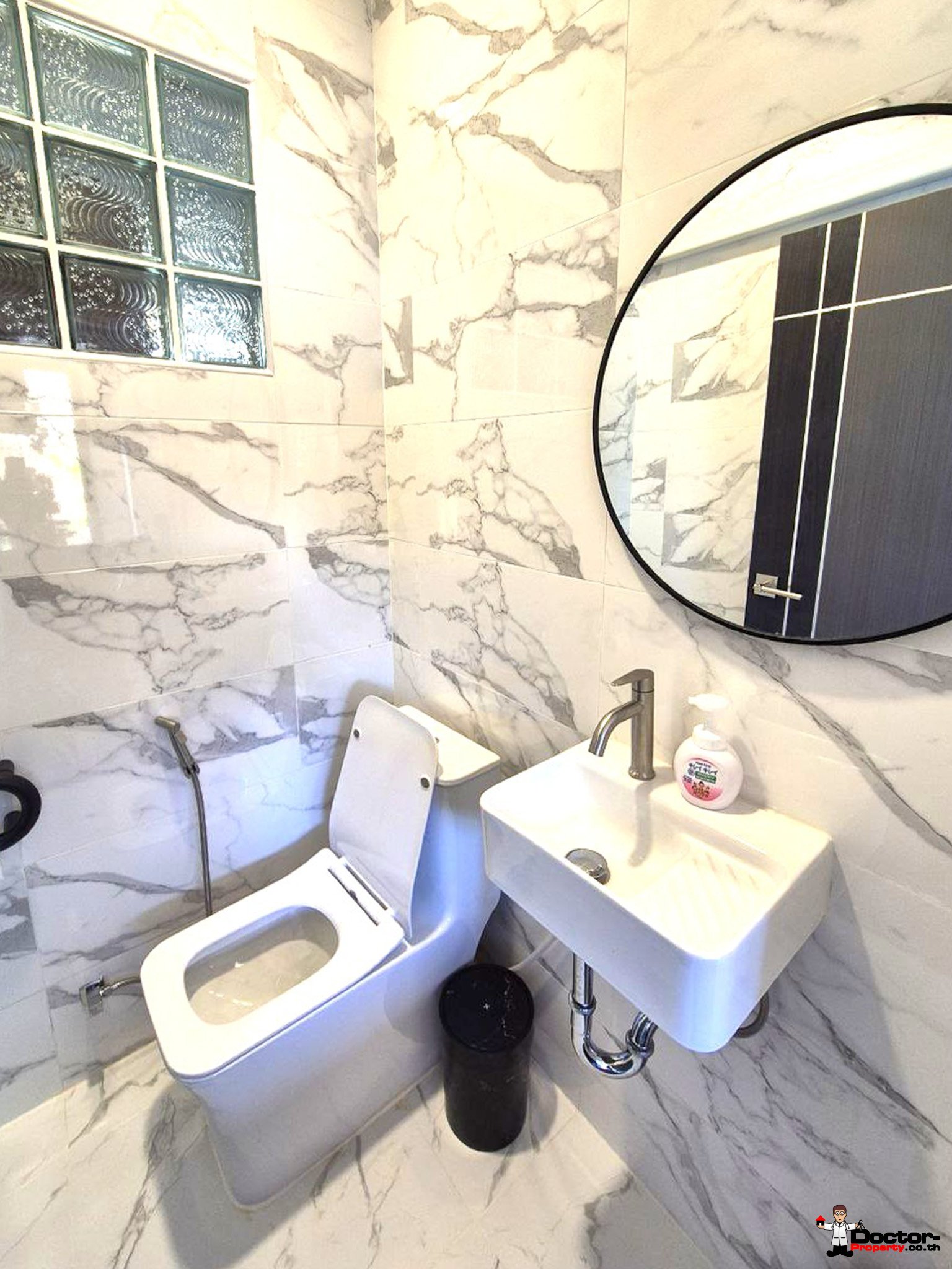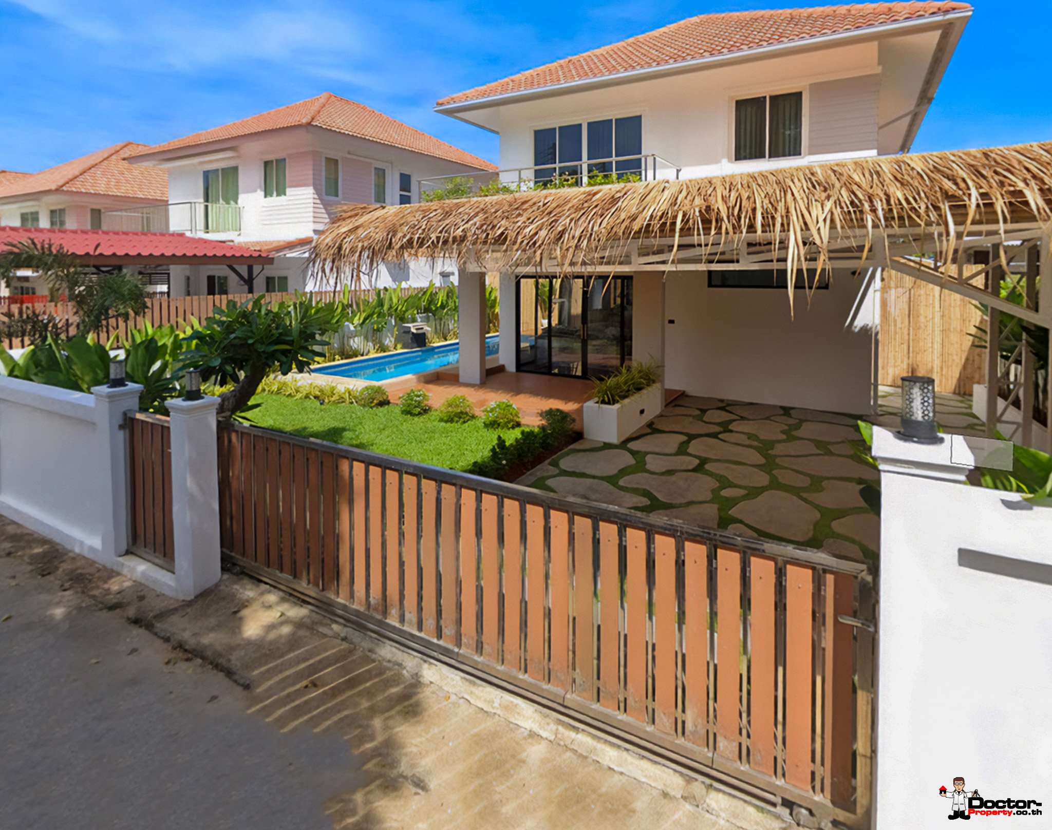 Dieses beeindruckende zweistöckige Haus wurde sorgfältig entworfen, um modernen Komfort mit natürlicher Eleganz zu verbinden. Auf einem 260 Quadratmeter großen Grundstück und einer großzügigen Wohnfläche von 200 Quadratmetern bietet das Anwesen viel Platz für Familien und Unterhaltung. Die Innenräume sind in einem raffinierten, natürlichen Design gestaltet und schaffen ein warmes und einladendes Ambiente, das mit der tropischen Umgebung harmoniert. Das Herzstück des Hauses bildet der private Swimmingpool mit einem beeindruckenden Wasserfall, der sowohl optisch ansprechend als auch beruhigend wirkt. Mit fünf geräumigen Schlafzimmern eignet sich die Residenz perfekt für größere Familien oder alle, die Gäste stilvoll beherbergen möchten.