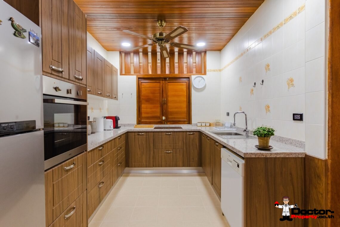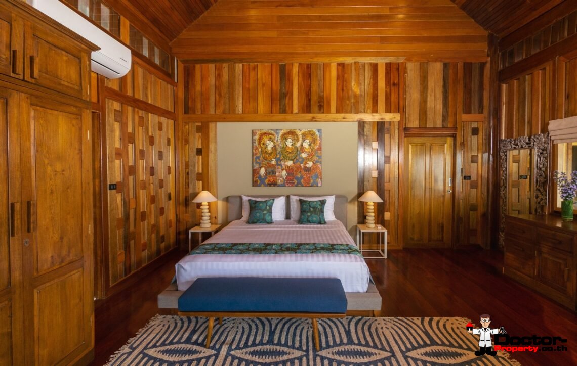 Die Villa ist elegant im traditionellen thailändischen Holzstil gestaltet, der offene Wohnbereich lässt frische Meeresluft durch das moderne Interieur strömen. Die separate westliche Küche, ausgestattet mit allen Geräten und Kochutensilien, bietet den Gästen ein Zuhause-Gefühl. Angrenzend an den Essbereich im Inneren finden Sie einen TV-Raum. Der Innenwohnbereich entfaltet sich in die offenen Terrassen, die einen mit blühenden Seerosen gefüllten Koi-Fischteich umgeben. Der überdachte Essbereich im Freien blickt auf den Poolbereich und die Pracht der Strandpromenade. Die Villa bietet Unterkunft für 6 Gäste, mit 3 Schlafzimmern, jedes mit eigenem Bad, gestaltet mit kühler zeitgenössischer Eleganz. Zwei Hauptschlafzimmer verfügen über eine eigene Terrasse am Meer mit Sitzgelegenheiten für 2 Personen, um individuelle Ruhezeiten in der tropischen Meereslandschaft zu genießen. Das dritte Schlafzimmer befindet sich neben dem Haupteingang der Villa. Im Garten der Villa befindet sich ein Thai-Sala, der Massagen im thailändischen Stil gewidmet ist.
