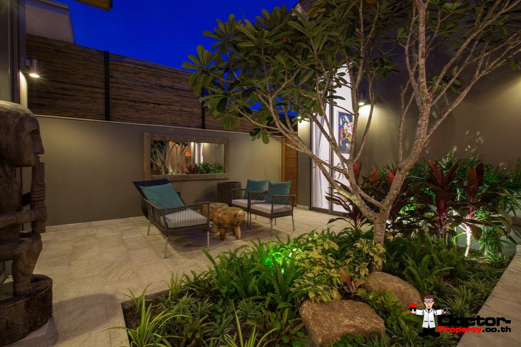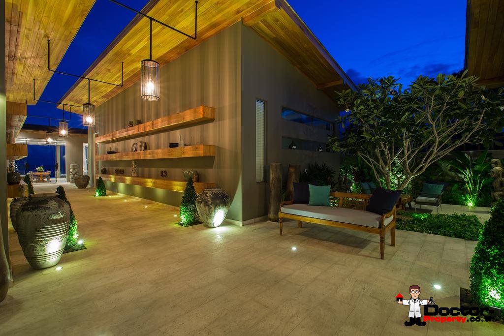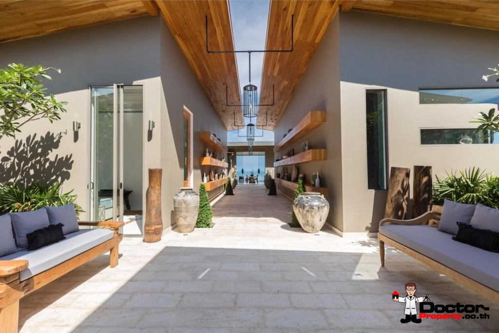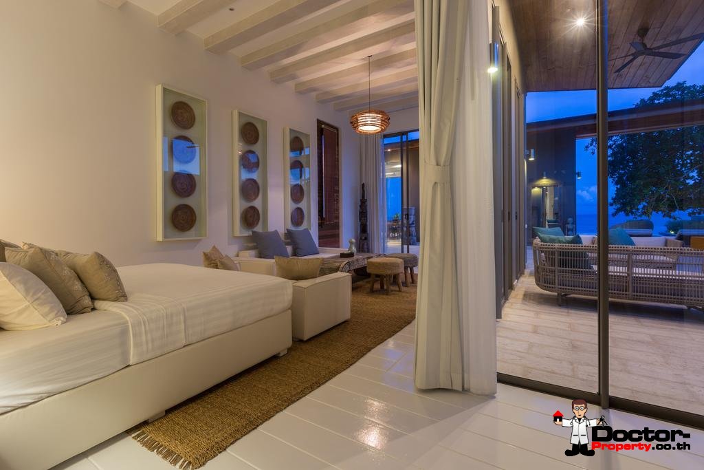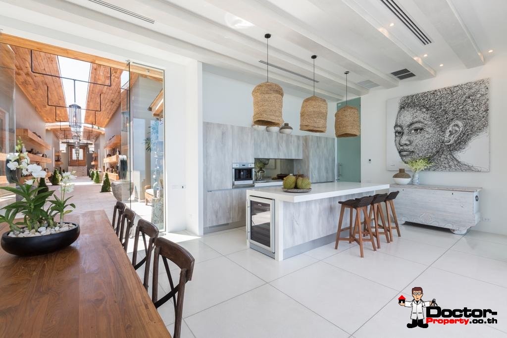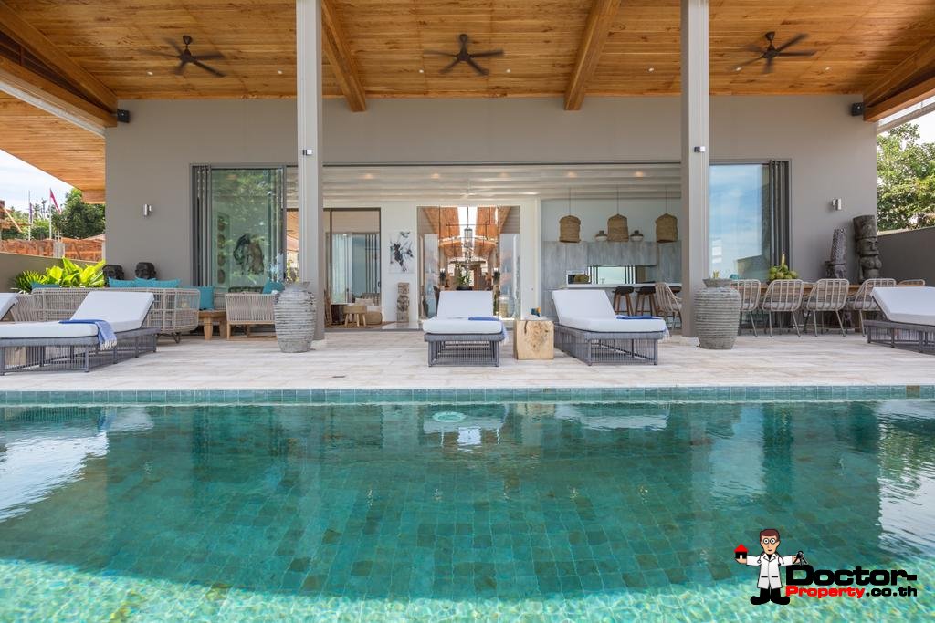 Wenn Sie die Villa betreten, werden Sie von der außergewöhnlichen Umgebung und den weitreichenden Ausblicken auf die nahe gelegene Insel Koh Tan und das dahinter liegende Festland, begeistert sein. Das offene Design der Villa fügt sich perfekt in die Strandlage und das tropische Klima ein. Das große Raumgefühl wird durch die Gewölbedecken und übergroßen Türen und Fenster verstärkt. Fünf geräumige Schlafbereiche mit einem zusätzlichen maßgeschneiderten Kinderzimmer / Spielzimmer machen dies zu einem idealen Ort für kleine Kinder.