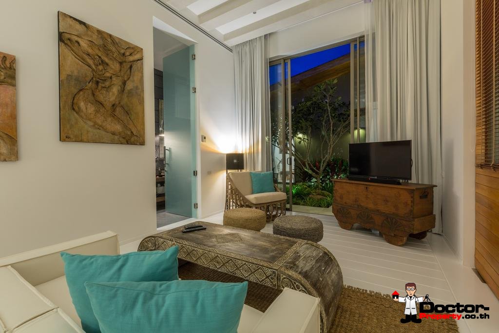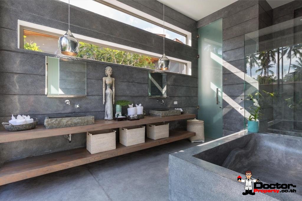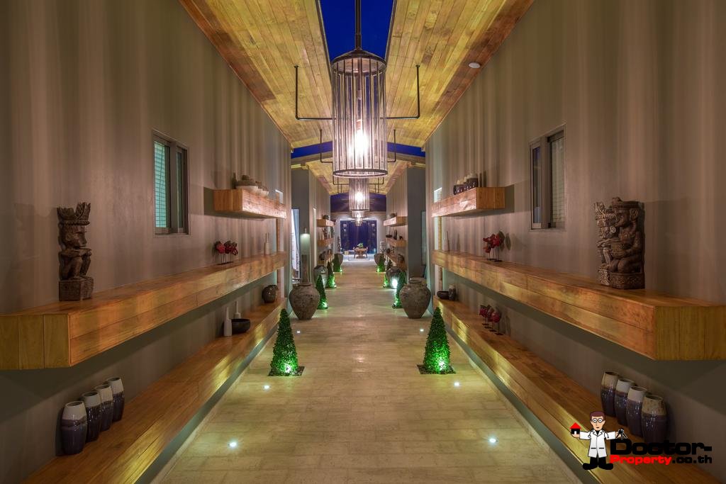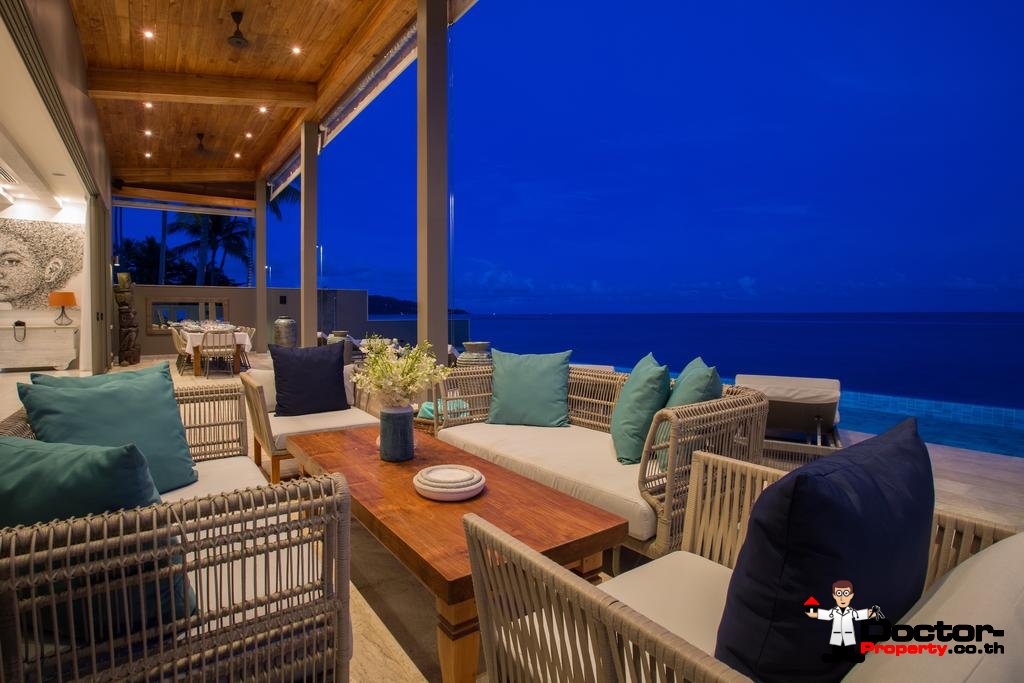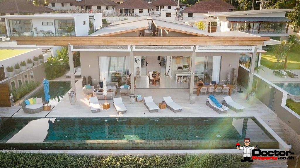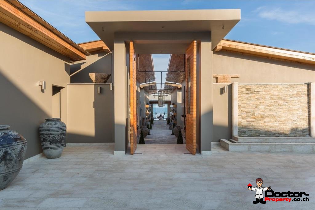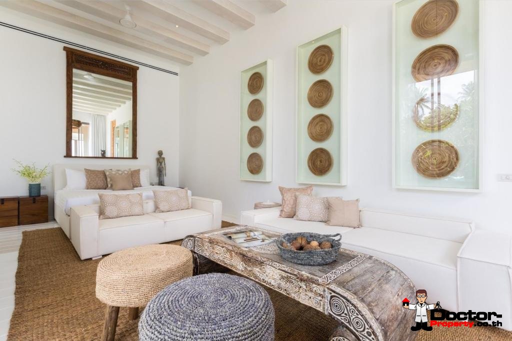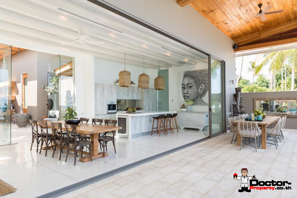 Wenn Sie die Villa betreten, werden Sie von der außergewöhnlichen Umgebung und den weitreichenden Ausblicken auf die nahe gelegene Insel Koh Tan und das dahinter liegende Festland, begeistert sein. Das offene Design der Villa fügt sich perfekt in die Strandlage und das tropische Klima ein. Das große Raumgefühl wird durch die Gewölbedecken und übergroßen Türen und Fenster verstärkt. Fünf geräumige Schlafbereiche mit einem zusätzlichen maßgeschneiderten Kinderzimmer / Spielzimmer machen dies zu einem idealen Ort für kleine Kinder.
