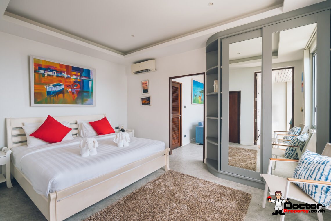 Die Villa verfügt über 7 Schlafzimmer, von denen eines derzeit als Arbeitszimmer genutzt wird. Es gibt 4 Schlafzimmer mit Meerblick, darunter das Hauptschlafzimmer in der obersten Etage des östlichsten Gebäudes, mit eigenem Bad mit Badewanne und begehbaren Kleiderschränken und einem eigenen privaten Sitzbereich im Freien. 2 Gästezimmer in der obersten Etage über der Küche teilen sich eine Whirlpool-Badewanne im Freien. Es gibt auch ein privates Wohnzimmer auf der Westseite, das derzeit als Musikstudio genutzt wird, aber ideal für ein Kinderspielzimmer oder ein Heimkinozimmer geeignet wäre. Es gibt einen zusätzlichen Gartenbereich mit Obstbäumen, der aber auch für Bauzwecke genutzt werden kann. Die Villa verfügt über separate, unabhängige Personalunterkünfte und wird derzeit von einer Haushälterin und einem Hausmeister betreut.