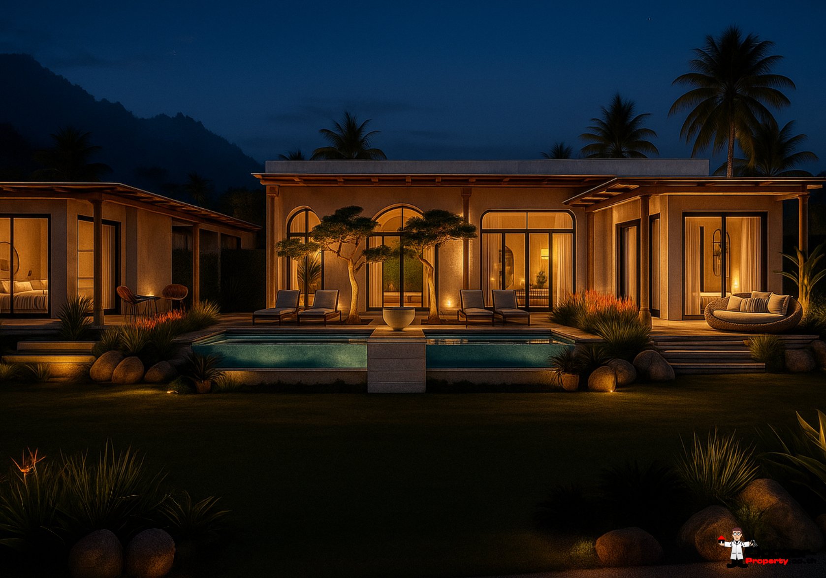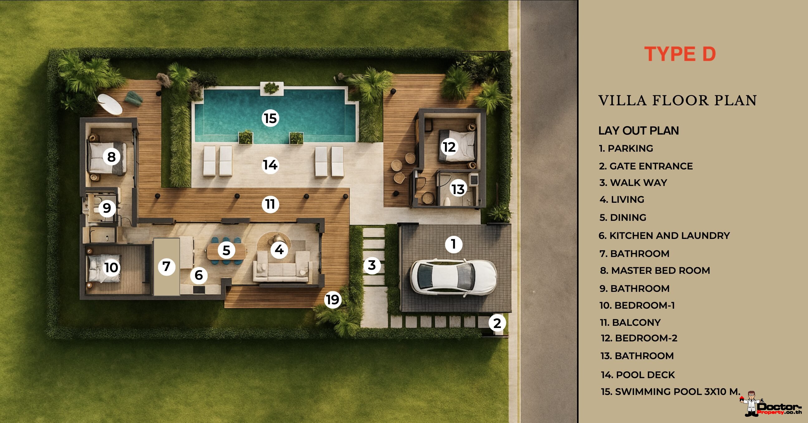 Diese Villa Typ D ist ein eindrucksvolles Beispiel für modernes Bohème-Design und verbindet zeitgenössische Architektur mit warmen, natürlichen Oberflächen. Die 308 m² große Residenz verfügt über drei geräumige Schlafzimmer, die jeweils auf maximalen Komfort und Helligkeit ausgelegt sind. Die Villa umfasst den kompletten Bau und die Fertigstellung, sorgfältig ausgewählte Möbel und Dekorationselemente, einen privaten 3 x 10 Meter großen Pool, einen angelegten Garten, ein sicheres Eingangstor, eine Garage und einen Außenzaun. Wichtige Infrastruktur wie die Hauptstrom- und Wasserversorgung ist bereits vorhanden und gewährleistet einen reibungslosen Übergang zum Inselleben.