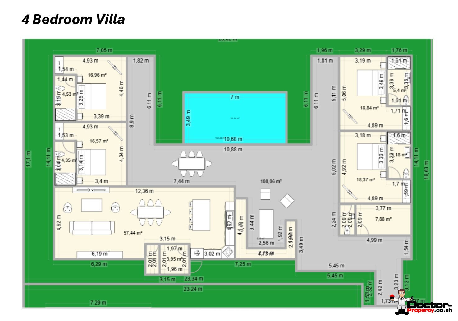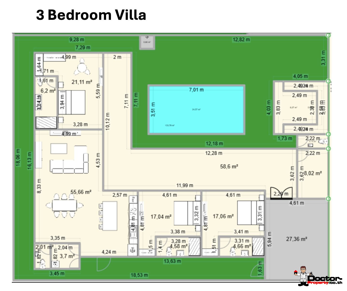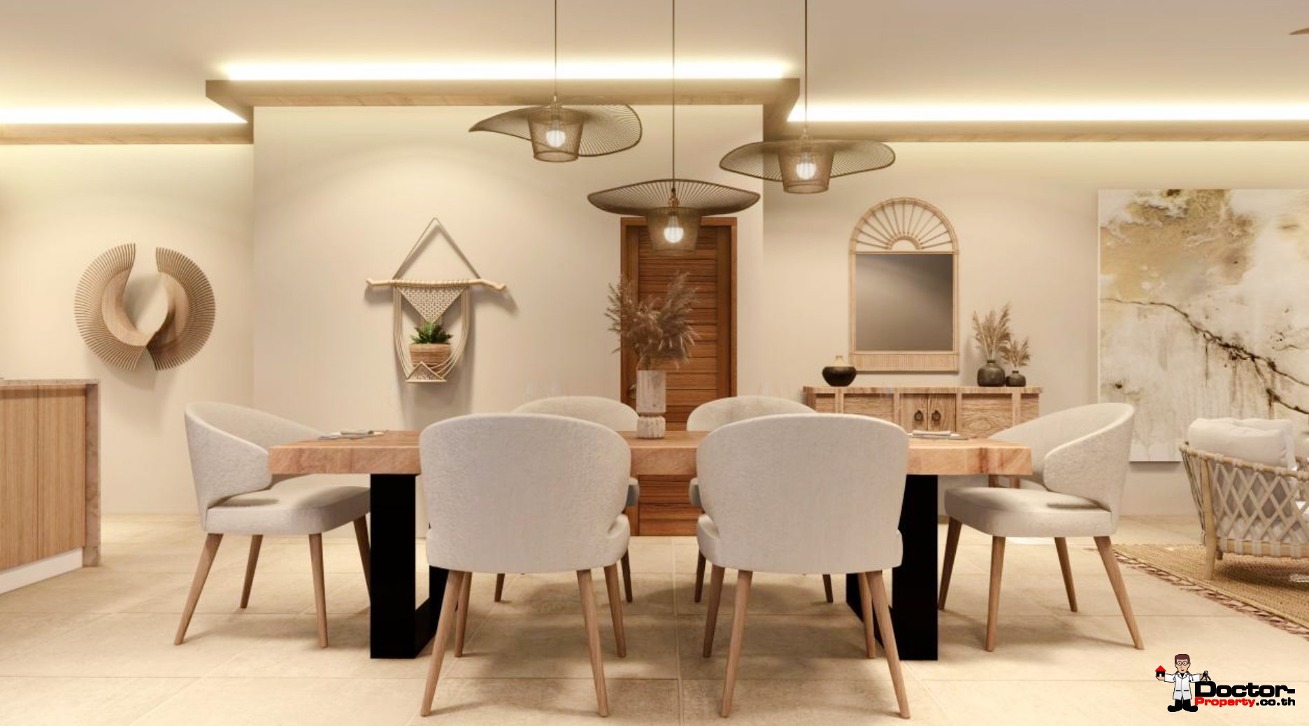 - Die Villen werden unmöbliert verkauft; Optionale Möbel und eine voll ausgestattete Küche sind ab 900.000 THB erhältlich.