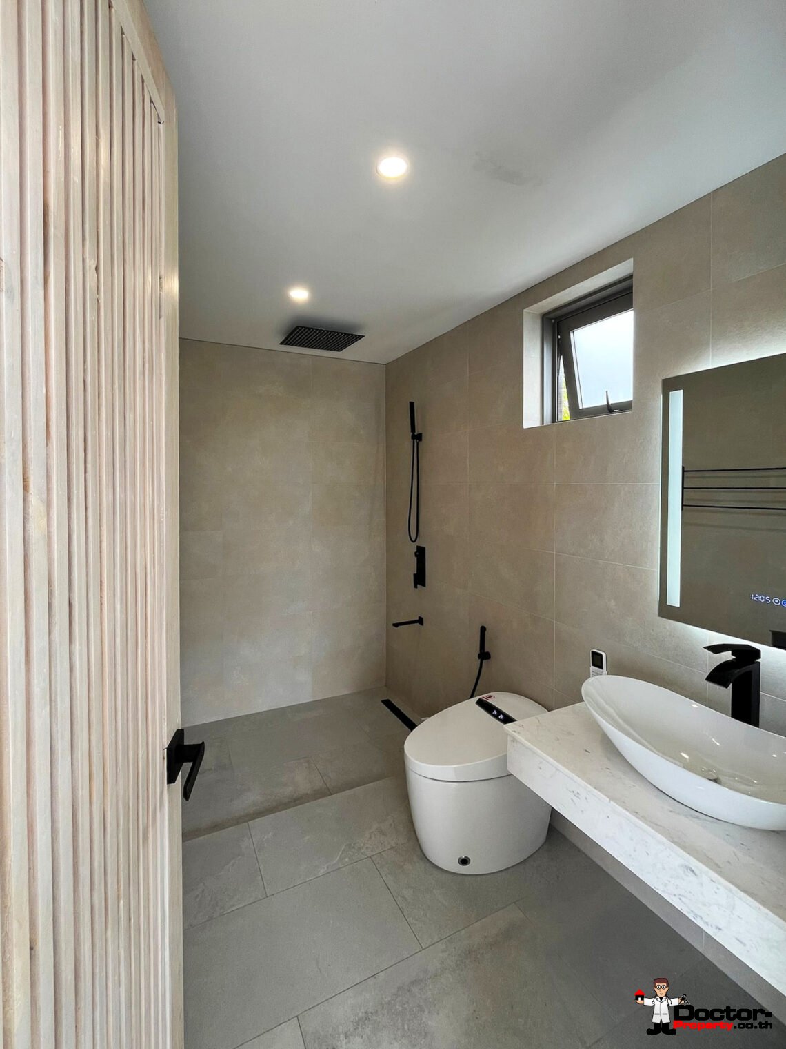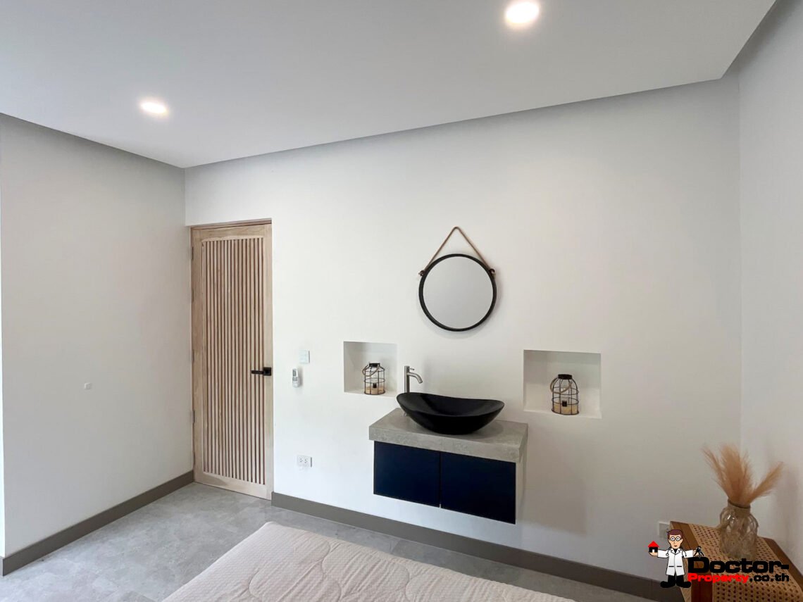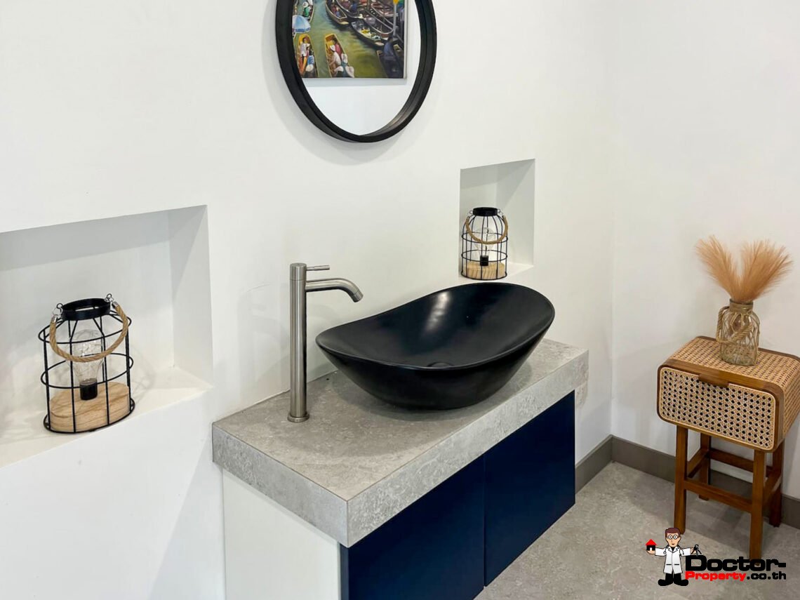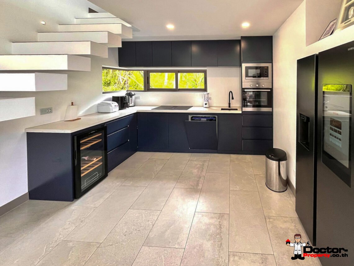 Mit drei großzügig bemessenen Schlafzimmern, jedes mit eigenem Bad, sorgt die Villa für ultimative Privatsphäre und Komfort. Die Master-Suite ist ein luxuriöser Rückzugsort und bietet direkten Zugang zum Poolbereich und atemberaubende Meerblicke – perfekt zum Entspannen und Erholen. Das Anwesen verfügt außerdem über einen beeindruckenden Infinity-Pool, der von einer geräumigen Sonnenterrasse und üppiger tropischer Landschaft umgeben ist. Großzügige Wohnbereiche im Freien bieten den idealen Rahmen für ein angenehmes Erlebnis am Pool oder ein Essen im Freien, während Sie den atemberaubenden Meerblick genießen. Diese Villa wird voll möbliert mit geschmackvollen, hochwertigen Möbeln und Oberflächen verkauft und ist somit sofort bezugsfertig. Jedes Detail wurde sorgfältig durchdacht, sodass Sie mühelos in das Inselleben eintauchen können. Darüber hinaus verfügt die Villa über eine voll ausgestattete moderne Küche für Komfort und Funktionalität.