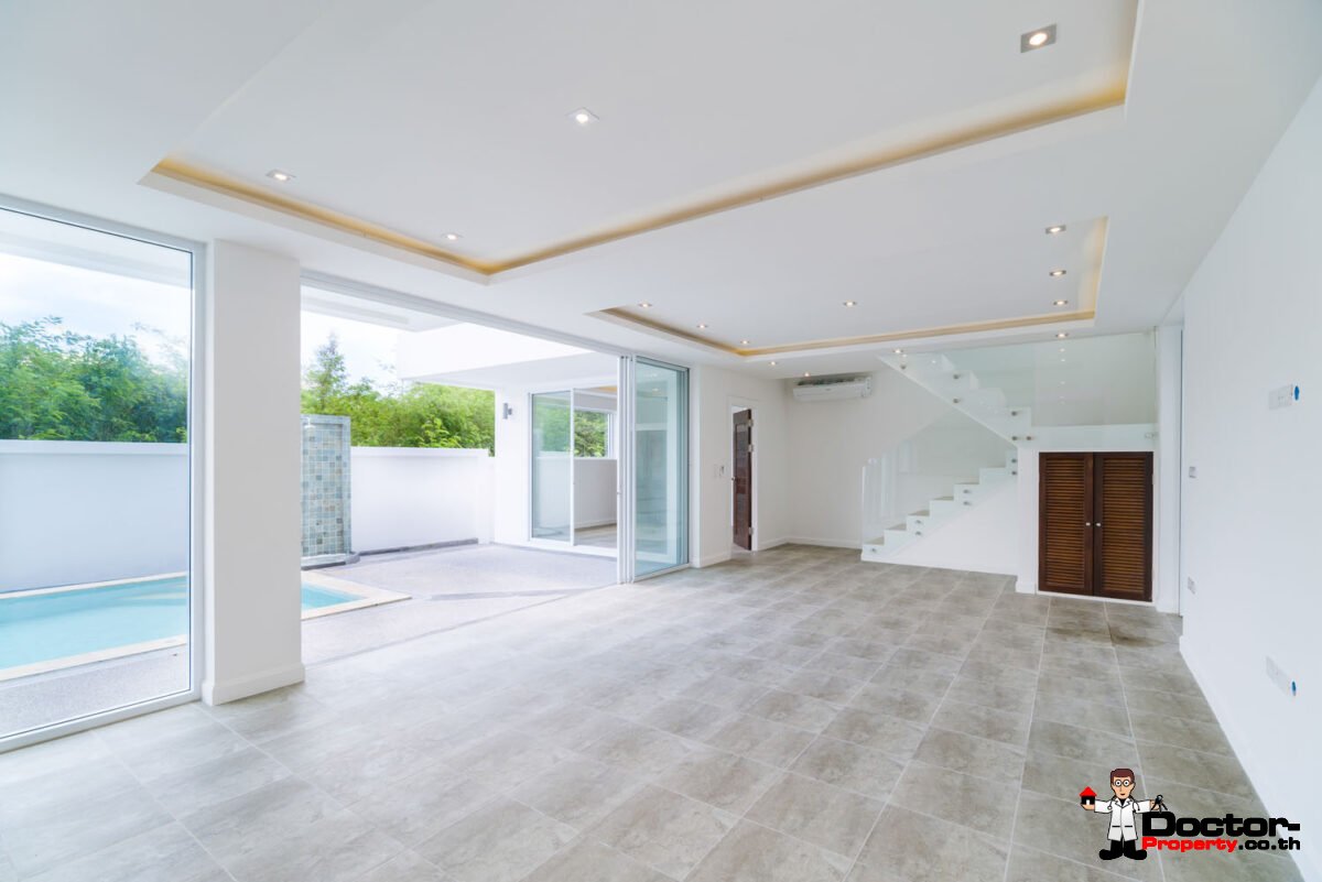 Diese neue moderne Villa verfügt über insgesamt 3 Schlafzimmer, 3 Badezimmer und einen offenen Wohn-, Ess- und Küchenbereich und ist über 2 Etagen verteilt. Jedes Schlafzimmer verfügt über einen eigenen Balkon. Die Villa ist bereits mit einer schönen westlichen Küche ausgestattet. Die Villa ist klimatisiert und wird unmöbliert angeboten. Im Außenbereich befindet sich der schöne Pool und eine umliegende kleine Terrasse.