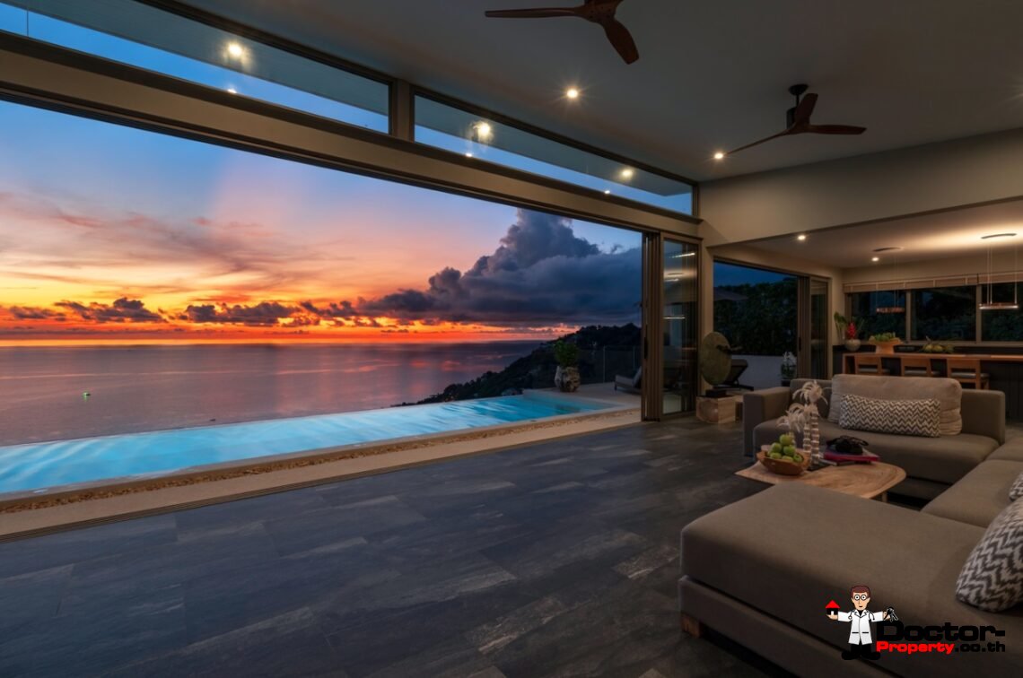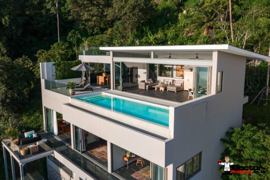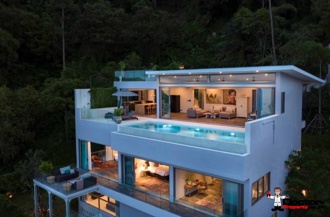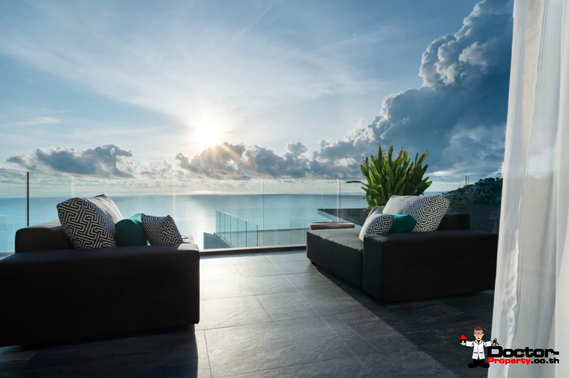 Diese traumhafte Villa besteht aus insgesamt 3 Schlafzimmer, 4 Badezimmer, einen offenen Wohn-, Ess- und Küchenbereich. Ebenfalls befindet sich ein separates Studio mit einer eigenen Küche und einem Schlafzimmer auf der Parkebene. Die Villa ist komplett hochwertig möbliert und klimatisiert. Der fantastische Pool und die Sonnenterrasse kann über die Wohn- und Küchenbereich erreicht werden. Der Infinity Pool selbst ist 12 x 3 Meter groß und bietet ein atemberaubenden Panoramablick auf das Meer. Im hinteren Teil befindet sich noch eine kleine Terrasse mit Bergblick. Ebenfalls haben Sie die Möglichkeit auf der Dachterrasse eine weitere Entspannungsoase für sich einzurichten.