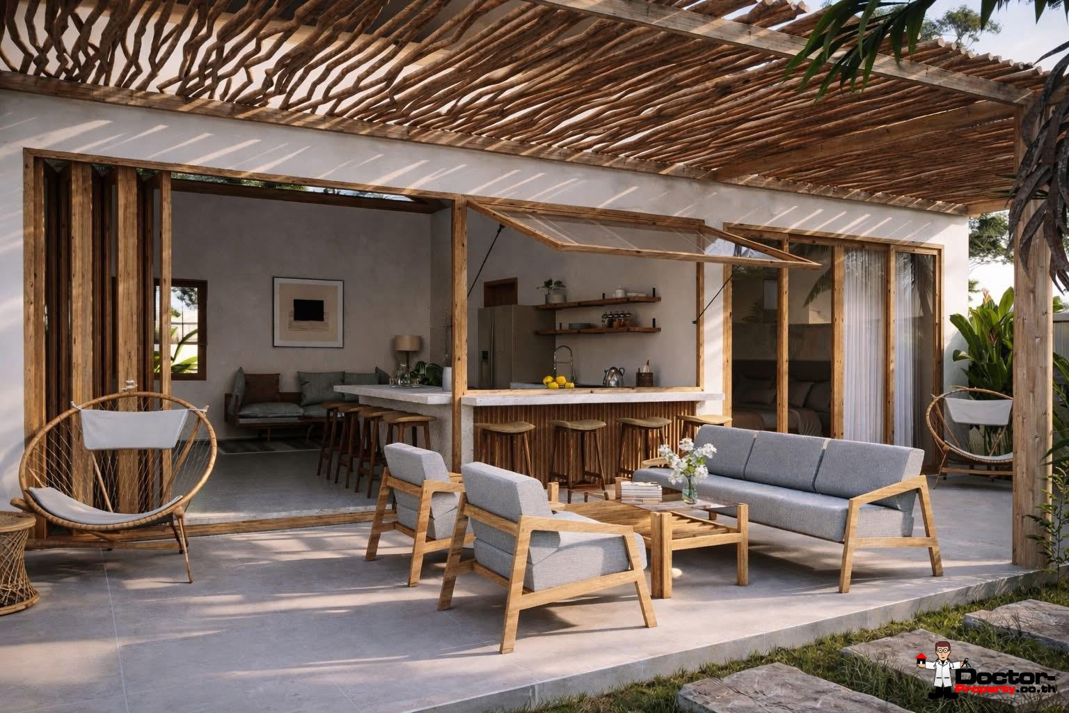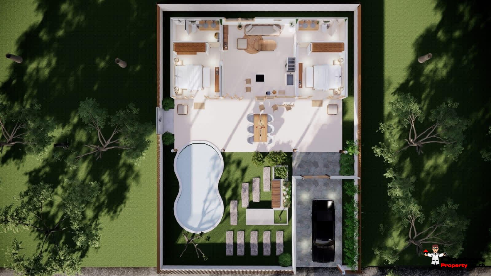 Die Villen sind durchdacht geplant und vereinen Komfort, Eleganz und Funktionalität. Die Villa mit einem Schlafzimmer bietet eine Wohnfläche von ca. 98 m², die mit zwei Schlafzimmern 118 m². Beide Grundrisse verfügen über einen markanten runden Swimmingpool, der sich harmonisch in die tropische Landschaft einfügt. Umgeben von üppigem Grün schaffen die Villen einen ruhigen Rückzugsort, der modernes Design mit natürlicher Schönheit verbindet und den Bewohnern ein privates und entspannendes Ambiente bietet.
