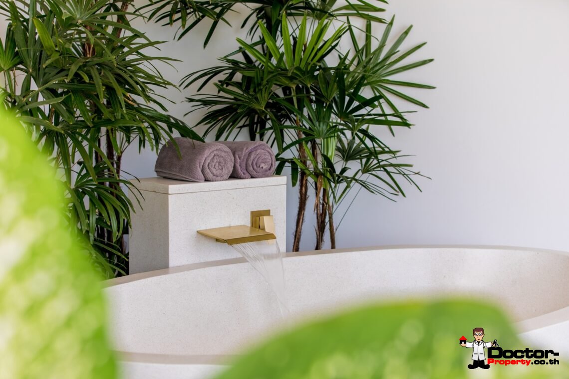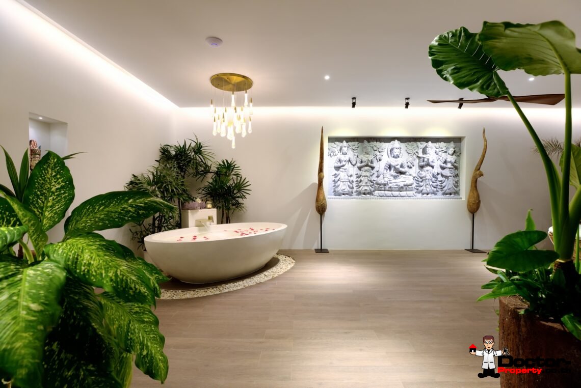 Ce qui distingue vraiment cette villa des autres dans les projets, c’est la pièce « Zen » finie sur mesure dans l’espace sous la villa. Ici, il y a une grande baignoire en béton faite à la main ainsi qu’un lit circulaire extérieur monté au plafond. Il existe un espace supplémentaire suffisant pour un banc de massage qui offrirait aux clients une expérience de type spa sans avoir à quitter la villa. Une musique relaxante peut compléter l’expérience via des haut-parleurs situés autour des espaces de vie des villas.