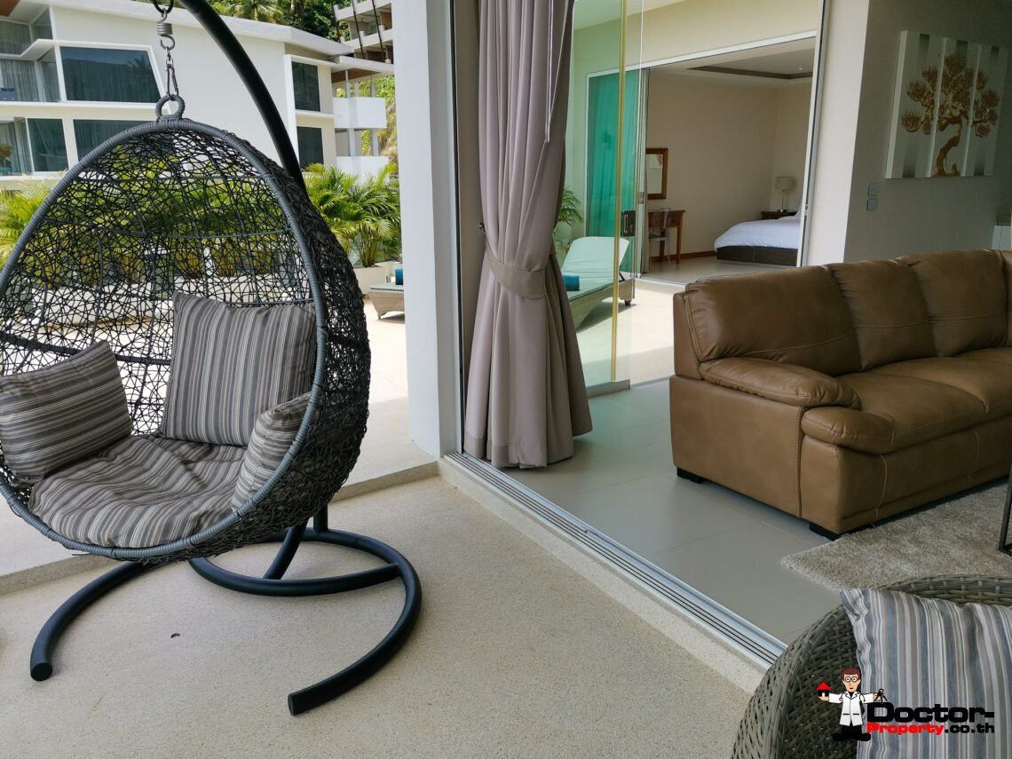 Cet appartement de 2 chambres est situé au deuxième étage et couvre une superficie de 151 m². La chambre principale a son propre coin salon extérieur privé qui fait face à la mer tandis que la chambre d’amis avec salle de bains est située à l’arrière de l’appartement. Aucune dépense n’a été épargnée dans la finition de l’unité et le développeur a réussi à créer une ambiance naturelle, avec des éléments de conception en bois et un décor général de bon goût. Le salon principal offre une vue panoramique sur la colline boisée d’un vert tropical luxuriant qui descend vers la mer d’azur et Koh Phangan en arrière-plan.