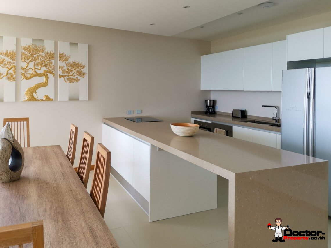Cet appartement de 2 chambres est situé au deuxième étage et couvre une superficie de 151 m². La chambre principale a son propre coin salon extérieur privé qui fait face à la mer tandis que la chambre d’amis avec salle de bains est située à l’arrière de l’appartement. Aucune dépense n’a été épargnée dans la finition de l’unité et le développeur a réussi à créer une ambiance naturelle, avec des éléments de conception en bois et un décor général de bon goût. Le salon principal offre une vue panoramique sur la colline boisée d’un vert tropical luxuriant qui descend vers la mer d’azur et Koh Phangan en arrière-plan.