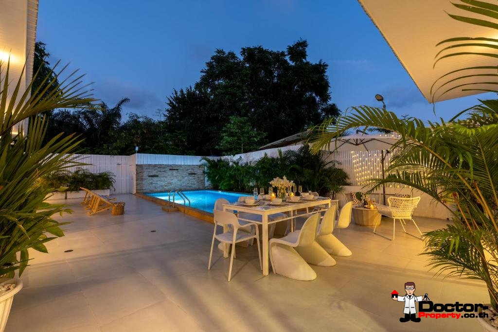 Cette villa d’exception de cinq chambres, située à Chaweng, sur l’île de Koh Samui, offre une opportunité rare d’acquérir une résidence alliant harmonieusement luxe contemporain et charme bohème. D’une superficie généreuse d’environ 550 mètres carrés, la propriété a été conçue avec soin pour offrir confort et élégance, ce qui la rend idéale pour une famille ou comme résidence secondaire de prestige.