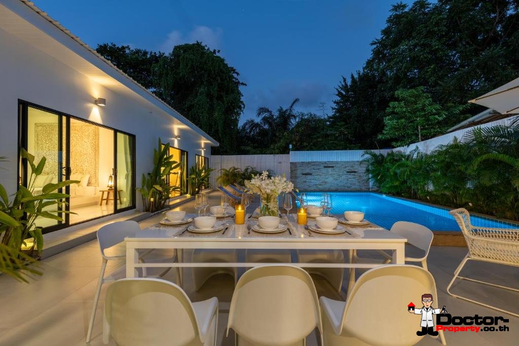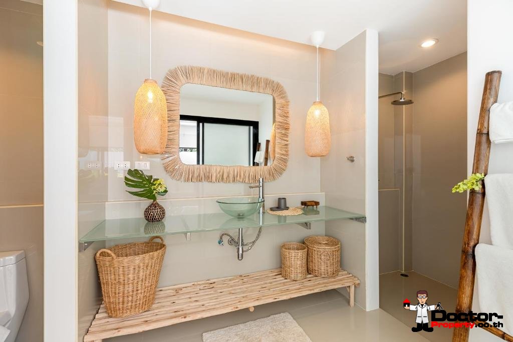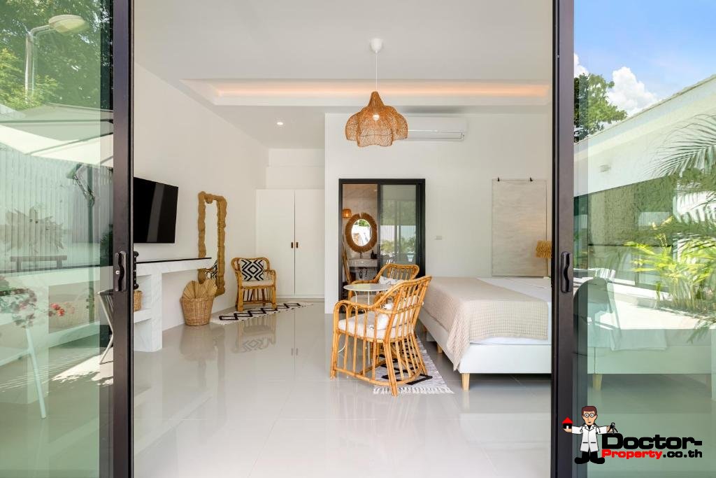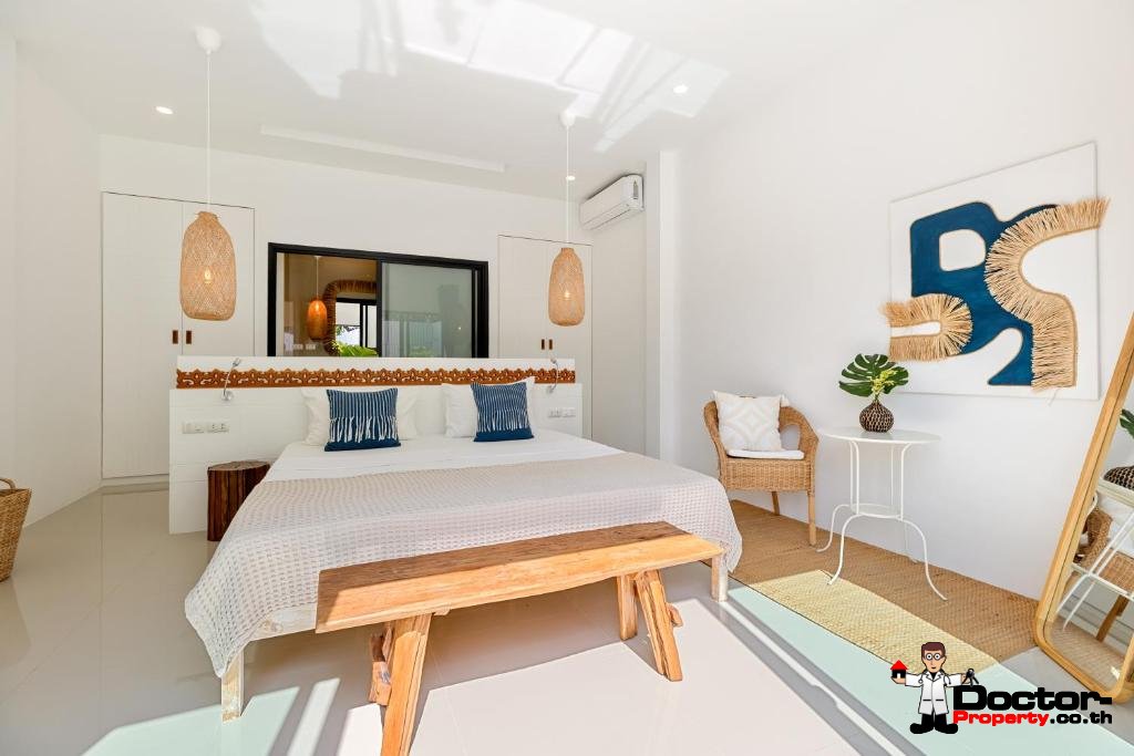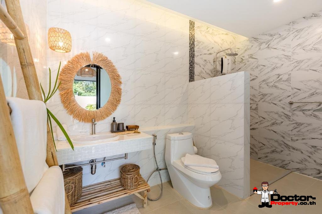 La villa bénéficie d’un emplacement idéal dans un cadre sécurisé et paisible, tout en restant proche des commodités animées de Chaweng. Le Central Festival Samui, principal complexe commercial et de loisirs de l’île, est à seulement quatre minutes en voiture et propose un large choix de marques internationales, de restaurants et de divertissements. La plage de Chaweng, réputée pour son sable immaculé et son ambiance animée, se trouve à seulement six minutes, offrant une destination idéale pour la détente et les loisirs. De plus, l’aéroport international de Samui est accessible en quinze minutes, facilitant ainsi les correspondances, tandis que le charmant village de pêcheurs de Bo Phut, célèbre pour ses restaurants en bord de mer et ses boutiques, est également à seulement quinze minutes en voiture.