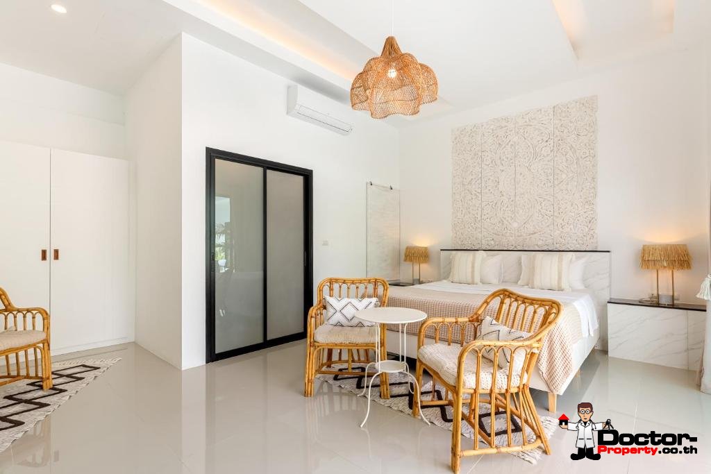 Le style architectural de la villa privilégie les espaces ouverts, les textures naturelles et les détails artistiques, créant une atmosphère de sophistication décontractée. Chacune des cinq chambres est spacieuse et dispose d’une salle de bains privative et d’un balcon privé offrant une vue sereine sur le paysage environnant. Les intérieurs sont ornés d’un mobilier sur mesure et d’une décoration soigneusement choisie, reflétant une esthétique bohème à la fois élégante et chaleureuse.