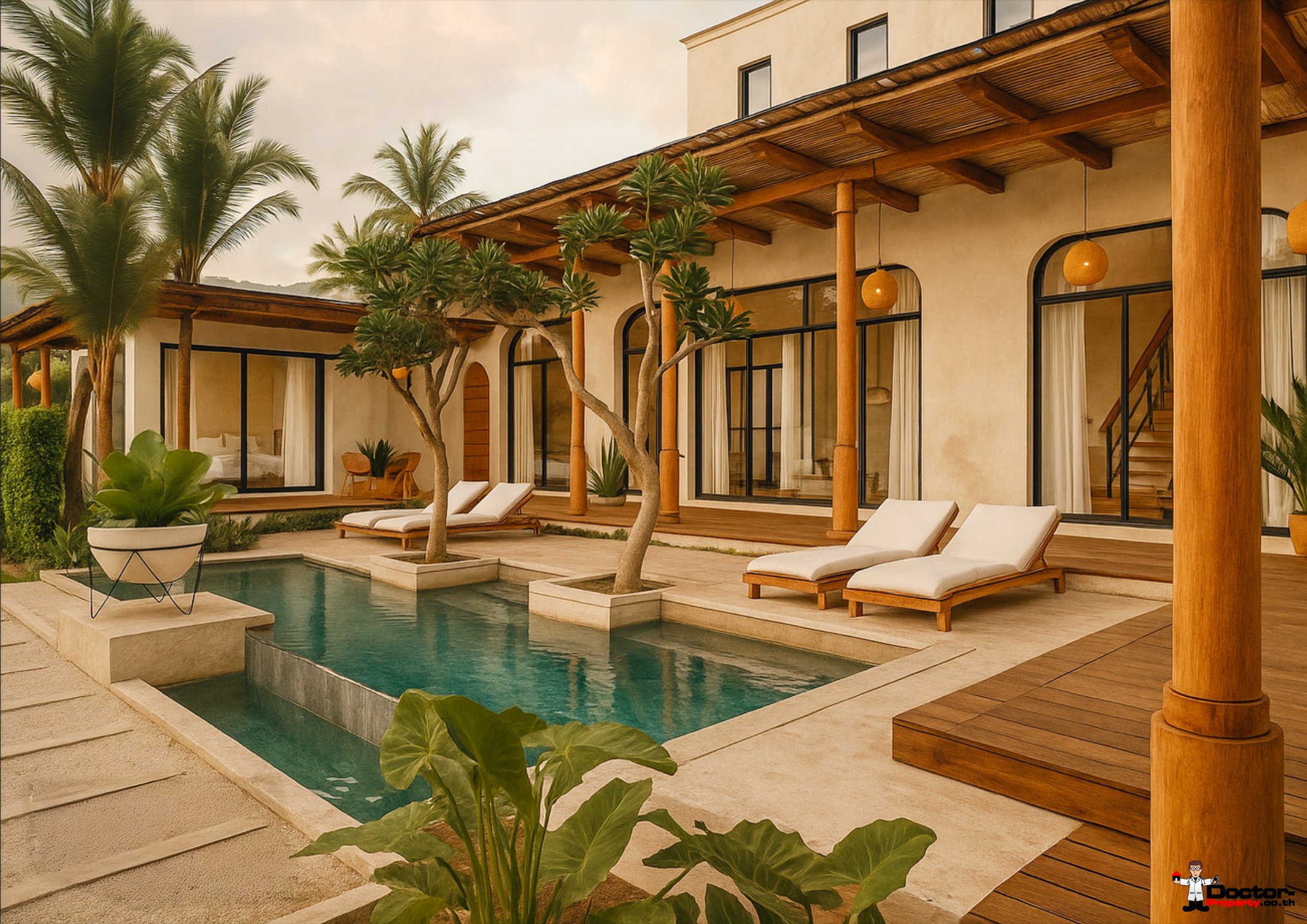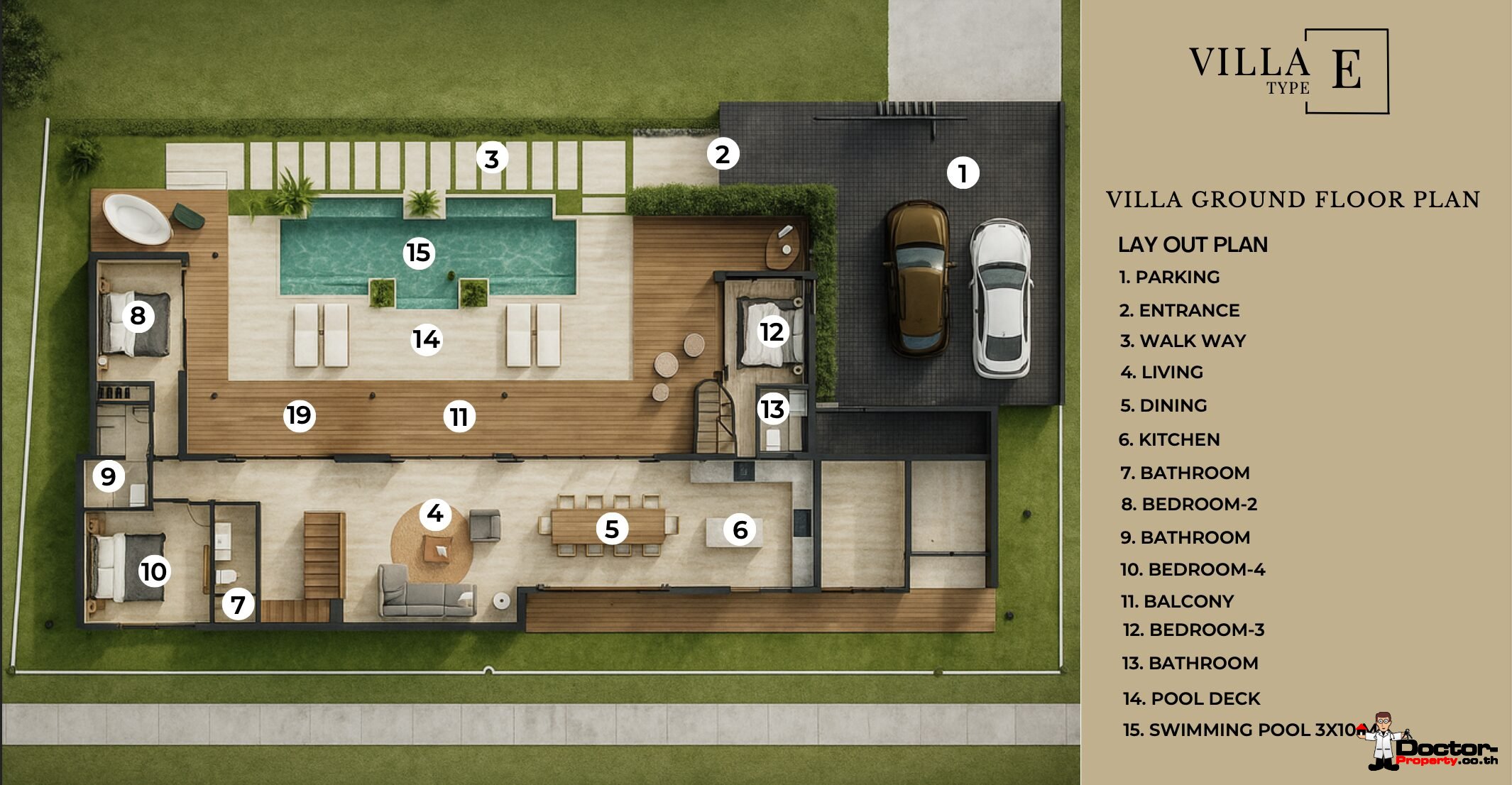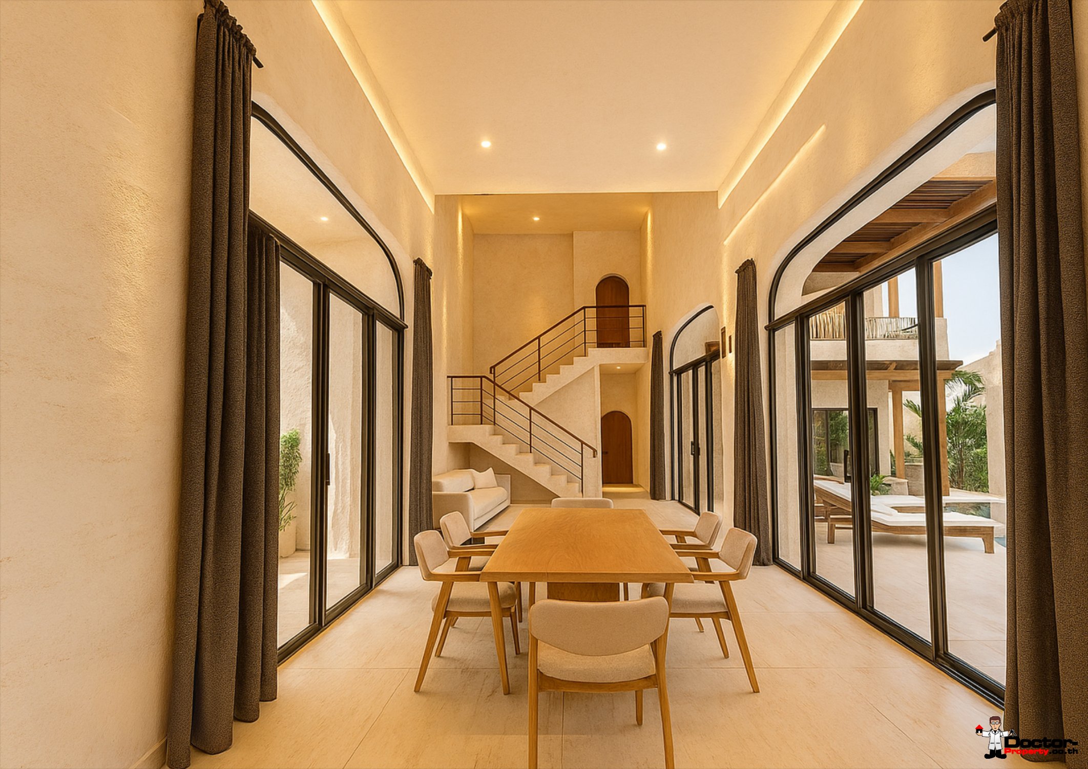 Cette superbe villa de deux étages, de type E, située dans la phase 3 du projet, est une spacieuse villa avec piscine et quatre chambres, conçue pour un mode de vie tropical moderne empreint d’une élégance bohème. Le rez-de-chaussée comprend un vaste espace de vie ouvert avec salle à manger, qui se prolonge harmonieusement sur la terrasse extérieure et la piscine privée, créant ainsi un cadre parfait pour recevoir ou se détendre en famille. À l’étage, les chambres sont agencées avec soin pour optimiser l’intimité et le confort, chacune bénéficiant de finitions élégantes et d’une abondante lumière naturelle. Avec son design contemporain, ses espaces généreux et sa piscine privée entourée d’une végétation luxuriante, cette villa offre un équilibre idéal entre luxe, fonctionnalité et confort d’un séjour de villégiature dans un cadre serein.