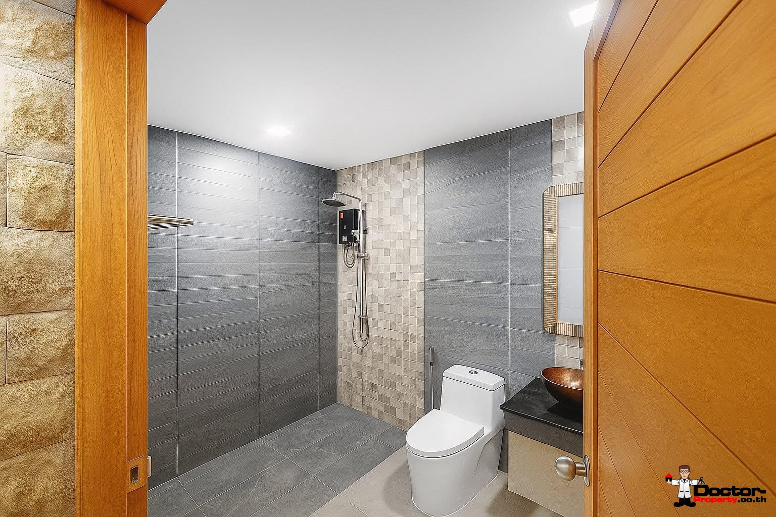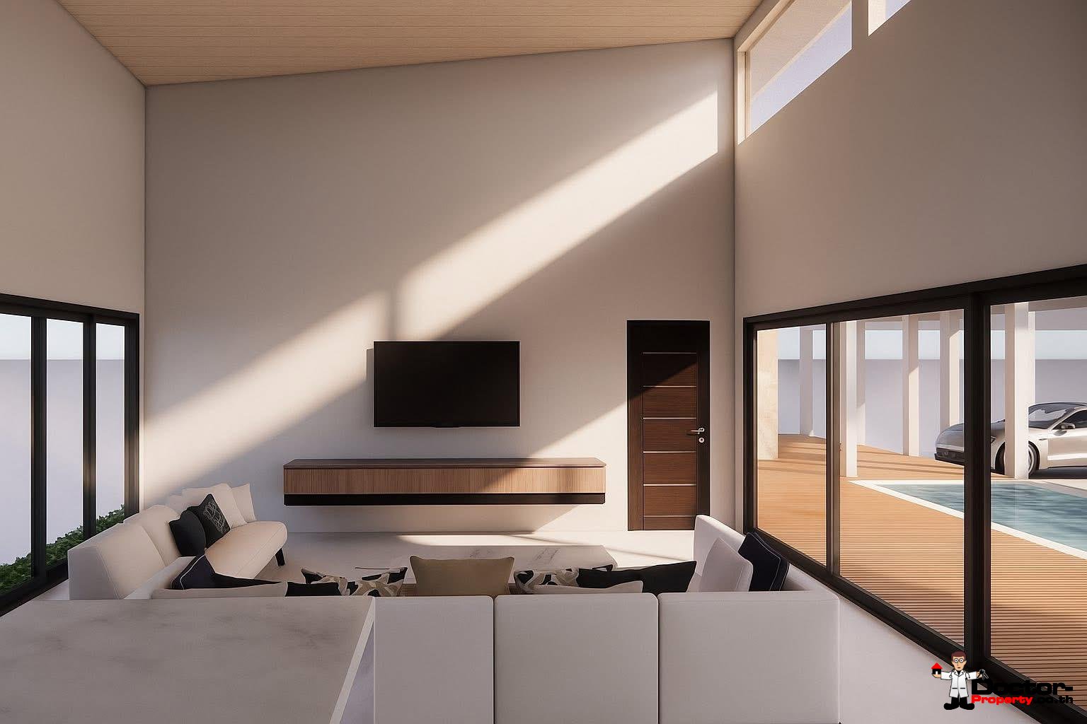 The open-plan living and dining area is enhanced by high ceilings and expansive glass doors, allowing natural light to flow throughout the interior. A modern kitchen space is provided, ready to be fitted with appliances and finishes according to the purchaser’s preferences. Offered unfurnished, the villa provides a unique opportunity for buyers to personalise the interiors and create a home that reflects their individual taste and lifestyle. Outdoors, the property is complemented by a private swimming pool, sun deck, and landscaped garden, offering an ideal setting for relaxation, entertaining, or enjoying Koh Samui’s year-round tropical climate.