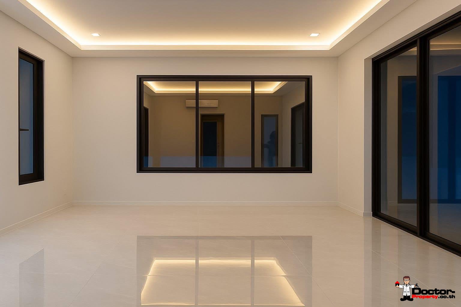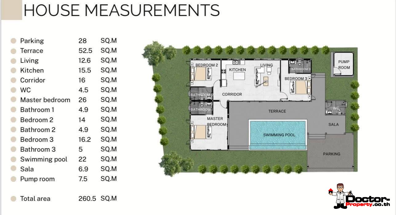 The villa presents a generous building area of 260.5 square meters, thoughtfully arranged to provide comfort, functionality, and style. The property features three spacious bedrooms, each with its own en-suite bathroom, ensuring privacy and convenience for both residents and guests. The master suite enjoys direct access to the pool terrace, creating a seamless connection between indoor and outdoor living.