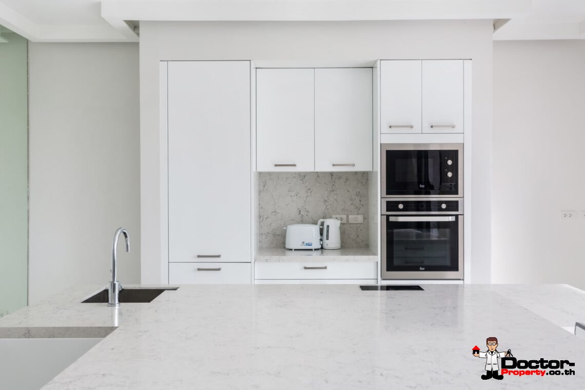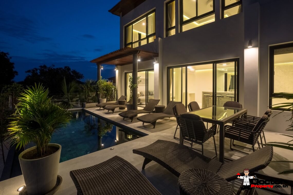 Outside, the villa boasts an impressive terrace with an infinity-edge pool that seems to spill directly into the ocean below. The large outdoor space offers the perfect setting for alfresco dining, lounging, or simply soaking in the incredible views of the surrounding coastline. The villa is surrounded by lush tropical landscaping, providing privacy and a peaceful environment to enjoy Koh Samui’s idyllic climate.