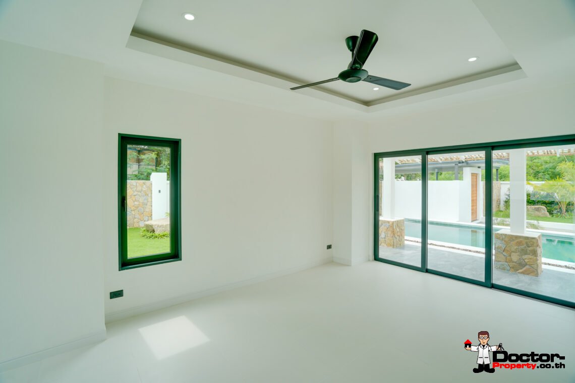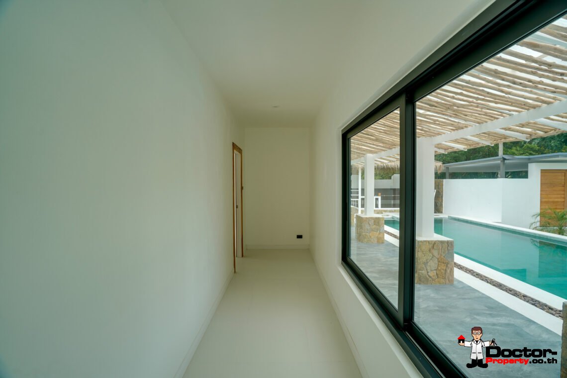 The villa offers 4 generously sized bedrooms, each with large windows that frame stunning views of the surrounding tropical landscape. The neutral, freshly renovated interiors create the ideal setting to add your personal design flair, whether you prefer a minimalist aesthetic or a more luxurious, personalized style. Enjoy complete privacy with your own refreshing swimming pool, perfect for cooling off after a day in the warm Samui sun. The pool area is surrounded by lush greenery, creating a serene and tranquil atmosphere for relaxing or entertaining guests.