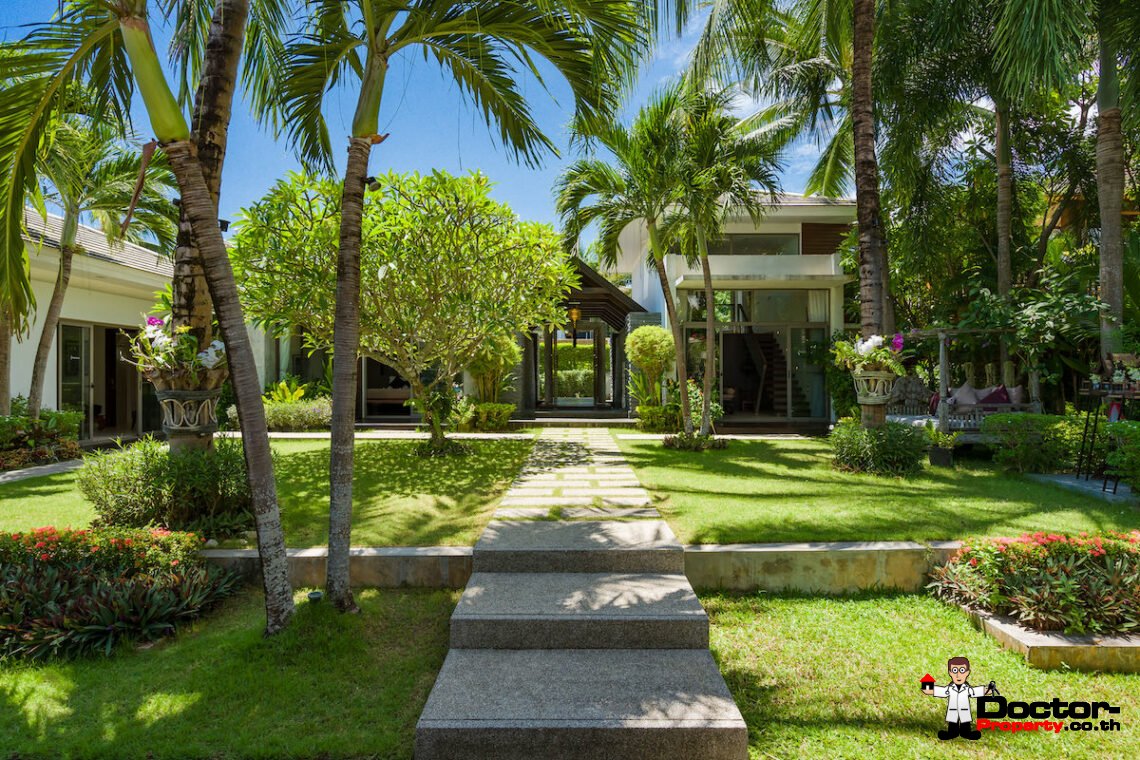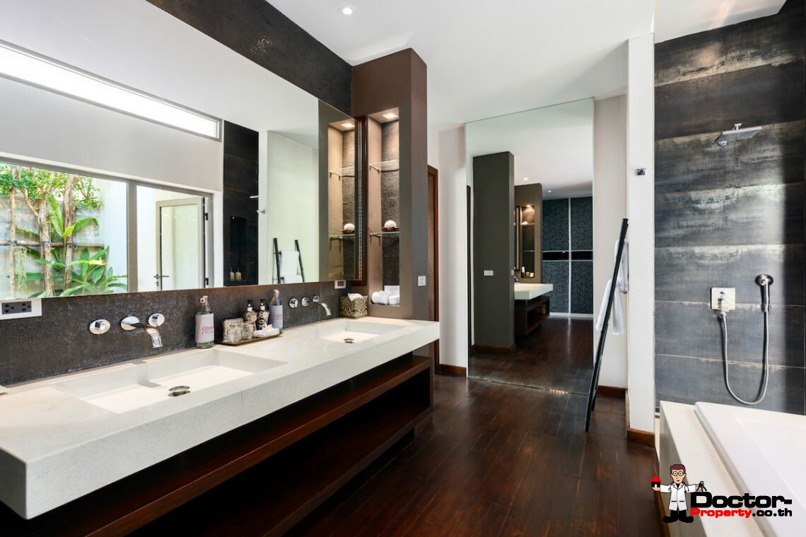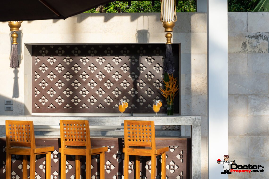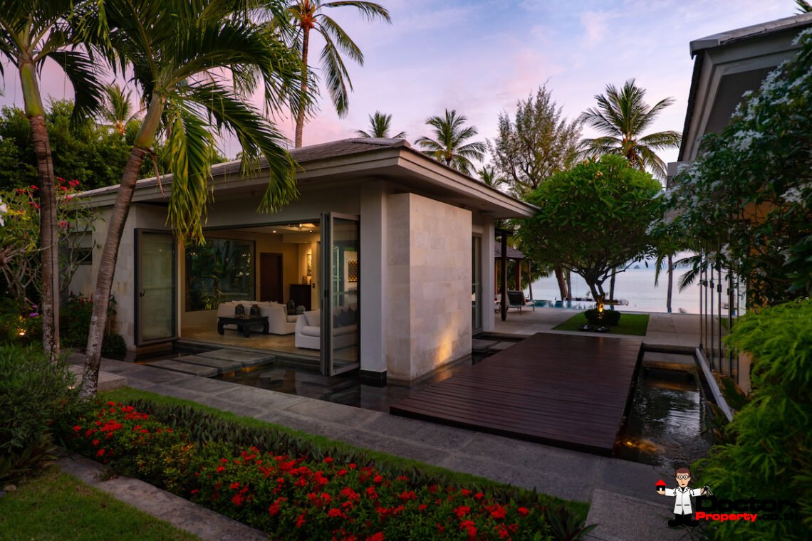 This beautiful beach villa consists of a total of 8 bedrooms and is designed in a modern design and was created with high-quality materials. The luxurious interiors (Philippe Stark – Italian luxury brand and Nouvelle Vague – Thai artist) have been perfectly harmonized and you will immediately feel at home in this beach villa. This property also includes 2 infinity pools and a beautifully landscaped garden with a sala right on the beach.