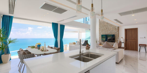 The villa is equipped with a state-of-the-art kitchen, ideal for preparing gourmet meals, and features the latest high-end appliances. The open-plan design ensures that the kitchen flows naturally into the living and dining areas, making it an ideal space for entertaining. Floor-to-ceiling windows throughout the villa invite the outdoors in, offering unobstructed views of the turquoise sea and the lush tropical surroundings. The property’s premium finishes, combined with beautifully landscaped grounds, reflect a sophisticated lifestyle, offering a perfect balance of modern living and natural serenity.