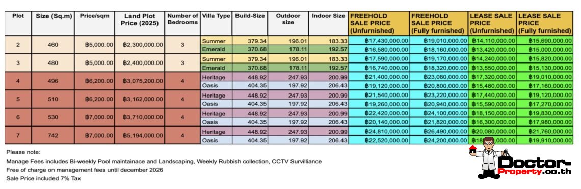| Villa No. | Beds/Bath | Land (m2) | Build (m2) | Price (THB) Ex. Fur |
