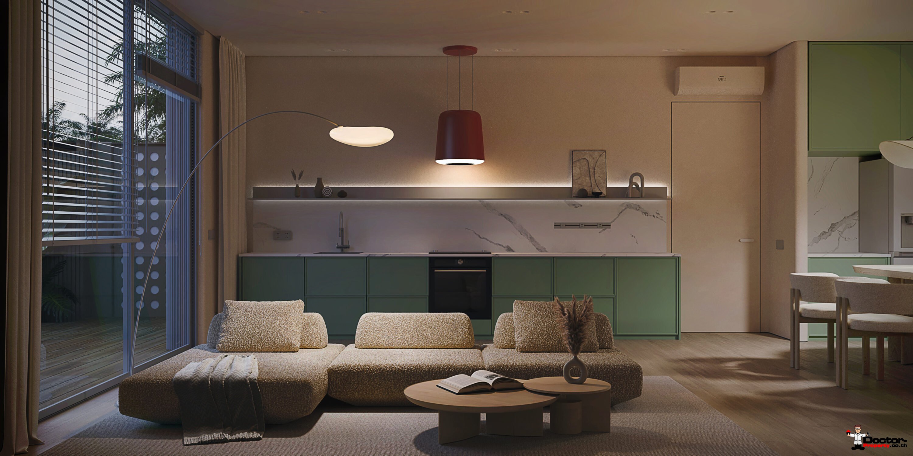 - Open‑plan living room & kitchen with panoramic 3 m windows