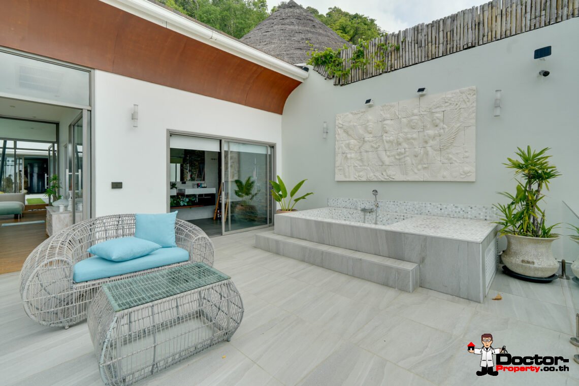 The interiors have been conceived with an emphasis on open‑plan living, seamlessly connecting indoor and outdoor spaces. Floor‑to‑ceiling windows frame panoramic vistas of the sea and surrounding mountains, while inviting abundant natural light into the home. At the heart of the property lies a private swimming pool, perfectly positioned to capture the tranquil atmosphere of the tropical landscape. Spacious terraces and landscaped gardens further enhance the sense of resort‑style living, creating a harmonious environment for relaxation and leisure.