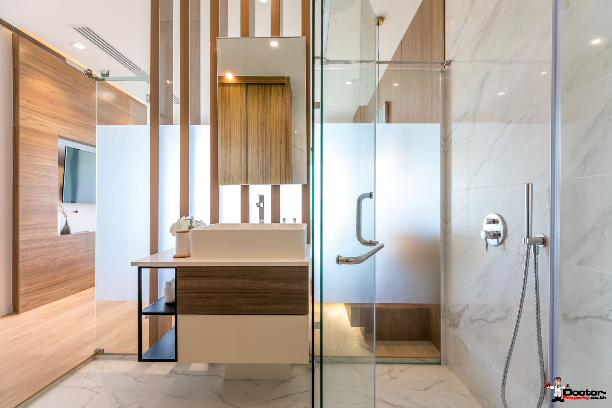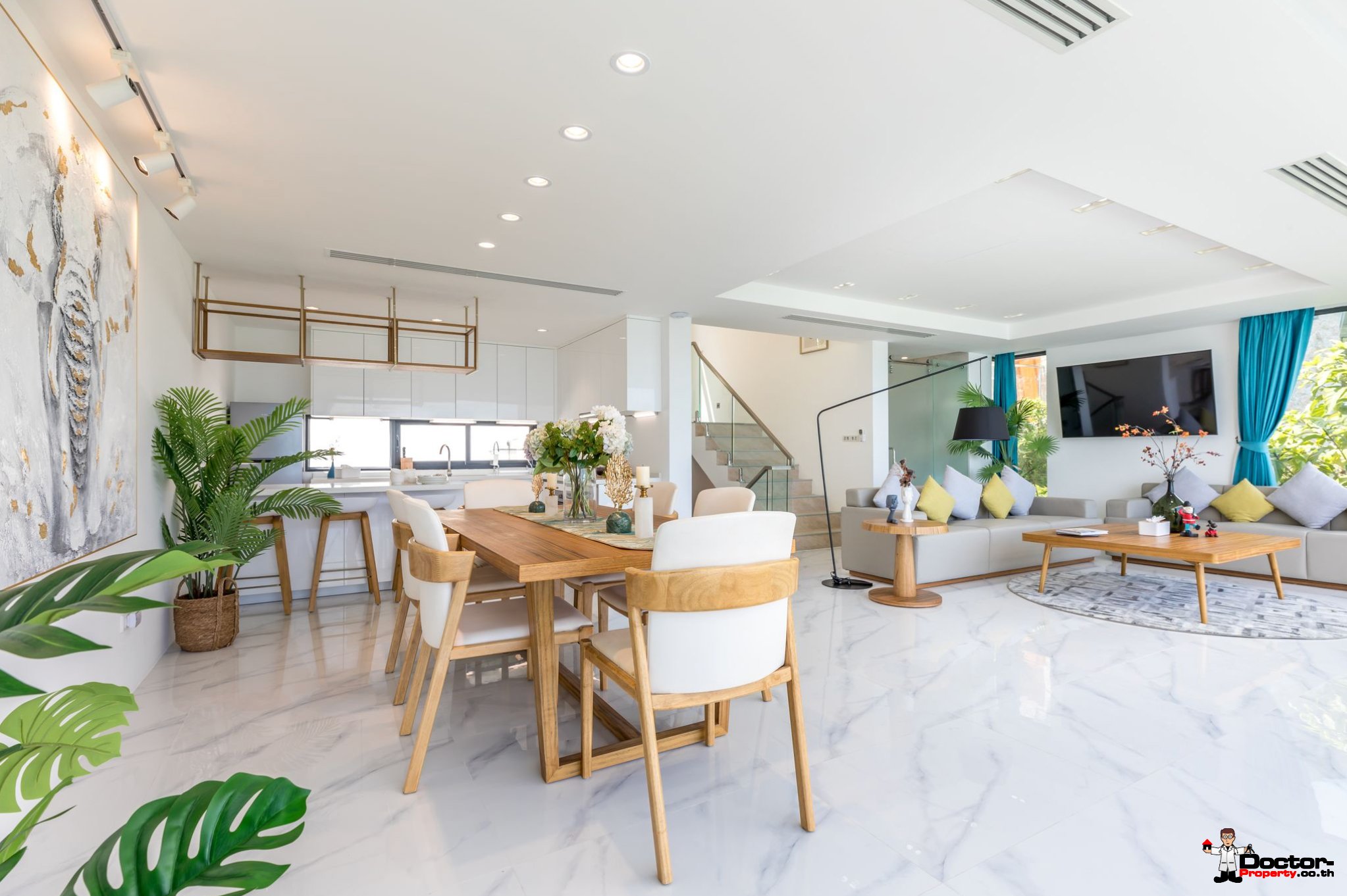 The villa is thoughtfully arranged across two levels, maximising space and natural light. It comprises 3 spacious bedrooms and 3 bathrooms, each designed to provide privacy and comfort. The open‑plan living and dining area flows seamlessly onto a private terrace, where an infinity swimming pool overlooks the turquoise waters of the Gulf of Thailand. The master suite enjoys direct access to the pool terrace and uninterrupted sea views, while the additional bedrooms are generously proportioned, each with en‑suite facilities. A fully equipped modern kitchen, ample storage, and landscaped surroundings further enhance the villa’s appeal. With its 2‑storey layout, the residence balances functionality with luxury, making it ideal for permanent living or as a high‑yield holiday rental investment.