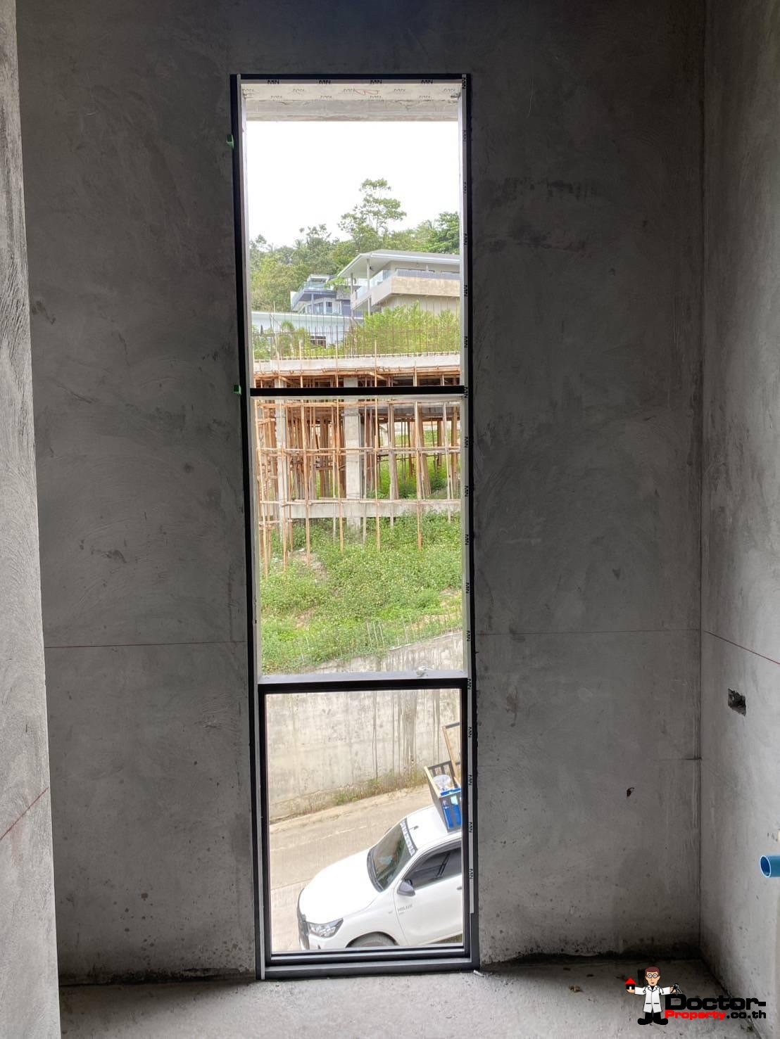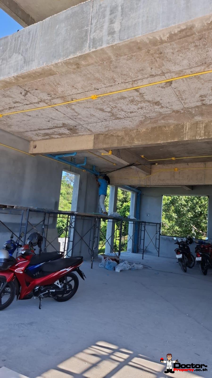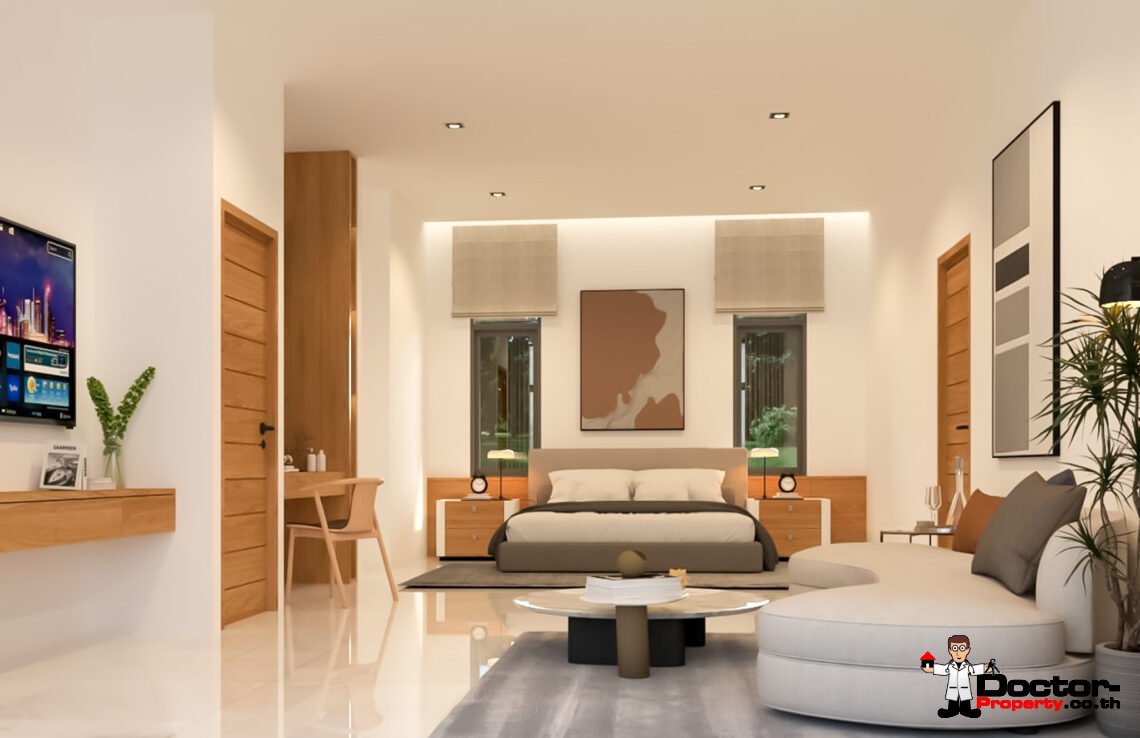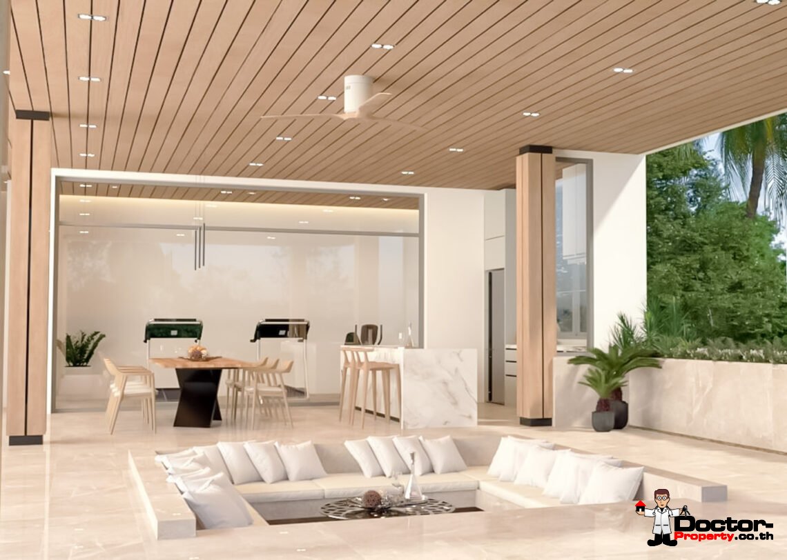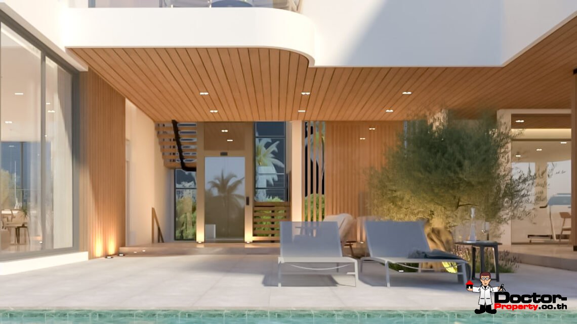 Each villa spans three floors. The first floor hosts a welcoming living room, Bedroom 5, and Bedroom 6, both with en‑suite bathrooms. The second floor is the heart of the home, featuring a private swimming pool, open‑plan kitchen and living area, fitness room, working space, hall, and a dedicated Thai kitchen. The third floor is reserved for the main sleeping quarters – Bedrooms 1 to 4 – each with an en‑suite bathroom and a spacious terrace to enjoy the tropical views.