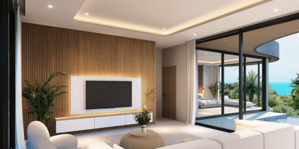 The modern villa has three bedrooms, three bathrooms and an open plan living, dining and kitchen area. All windows are floor-to-ceiling, providing plenty of light and a beautiful sea view. The villa is tastefully decorated and will be sold fully furnished. Outside is a large pool (8m x 3m) and a large covered terrace (34m2). An air-conditioned storage room also belongs to the villa. All rooms are fully air-conditioned. The villa was built in 2013 and is in excellent condition.