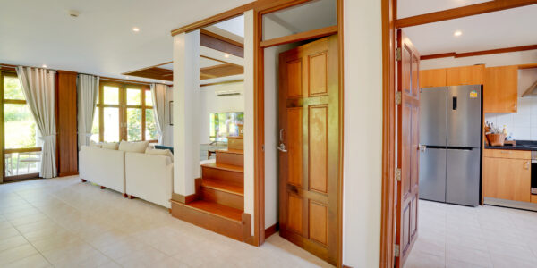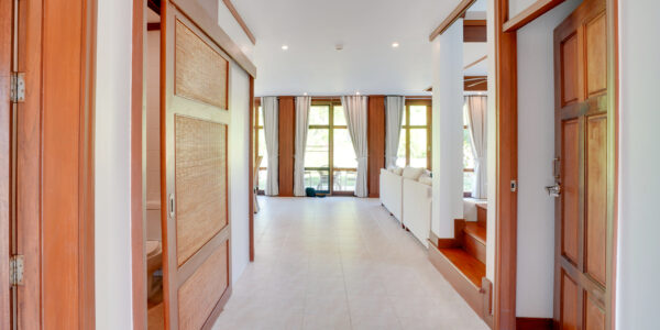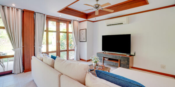 The heart of the villa is the expansive living area, where large sliding glass doors open up to lush garden views. Comfortable grey sofas and rich wooden accents create a warm and welcoming environment. Adjacent to this space is the dining area, which looks out onto the garden and flows effortlessly into the outdoor sala, perfect for al fresco meals and entertaining.
