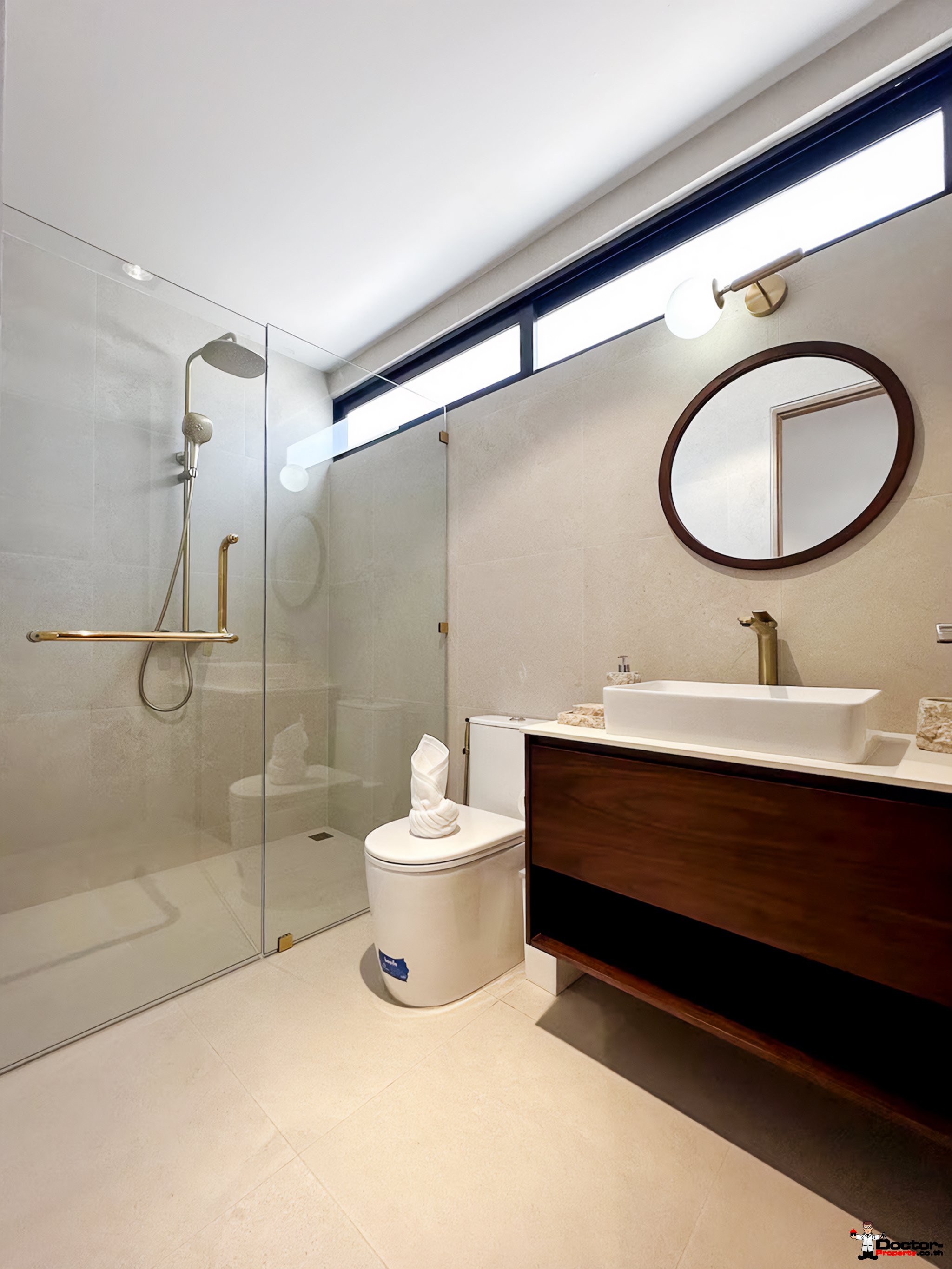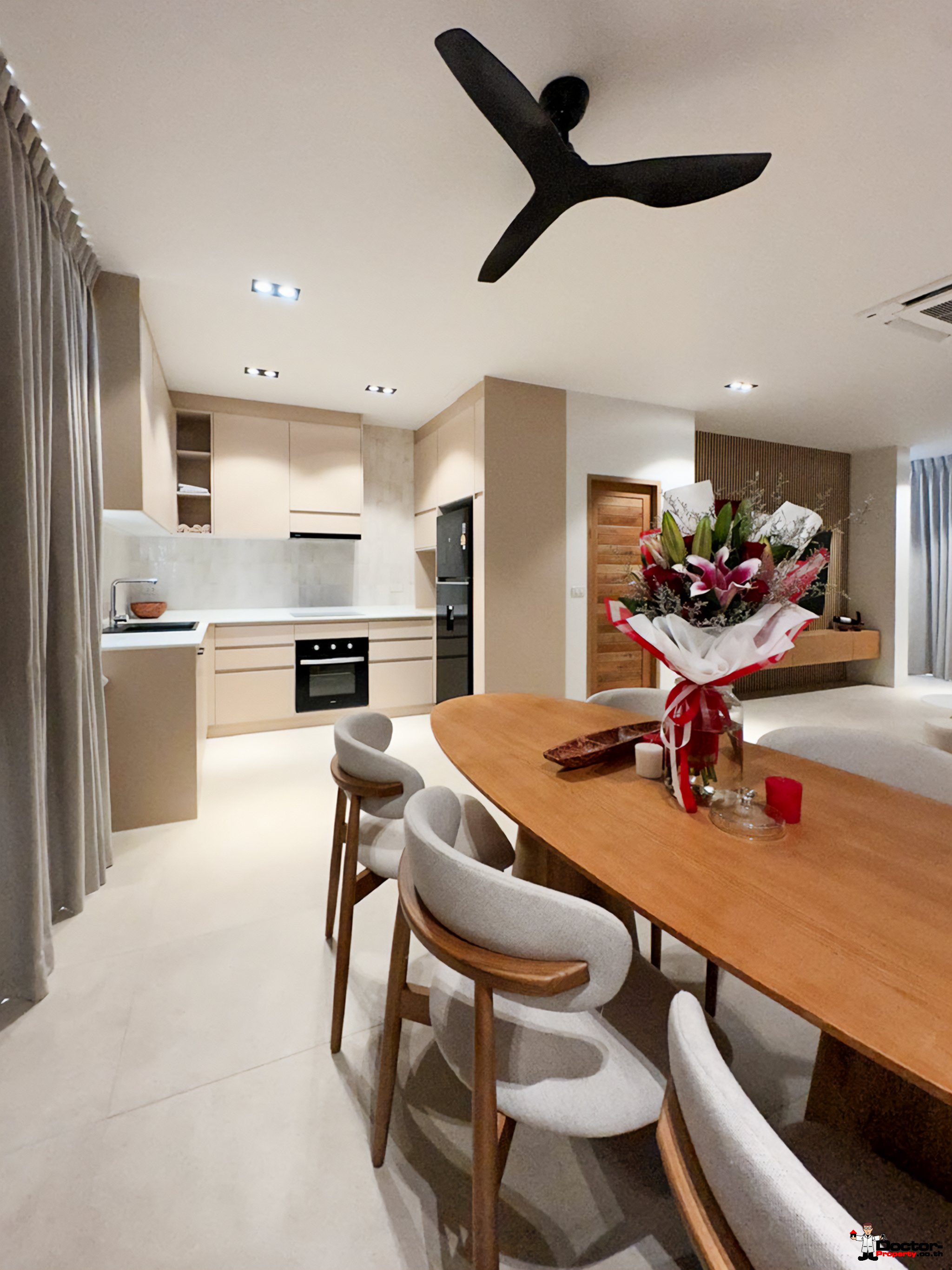 The villa comprises 3 bedrooms, each with 2.5 bathrooms, ensuring privacy and comfort for family members or guests. The master suite, located on the upper floor, boasts a private balcony overlooking the pool and surrounding greenery. Outdoors, the private swimming pool is complemented by a sun deck and landscaped garden, offering a tranquil space for relaxation or entertaining. The property is offered fully furnished, allowing buyers to move in immediately.