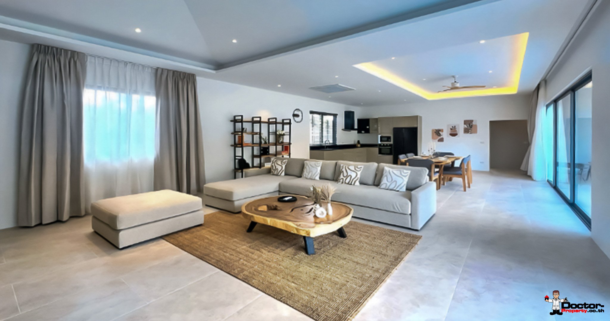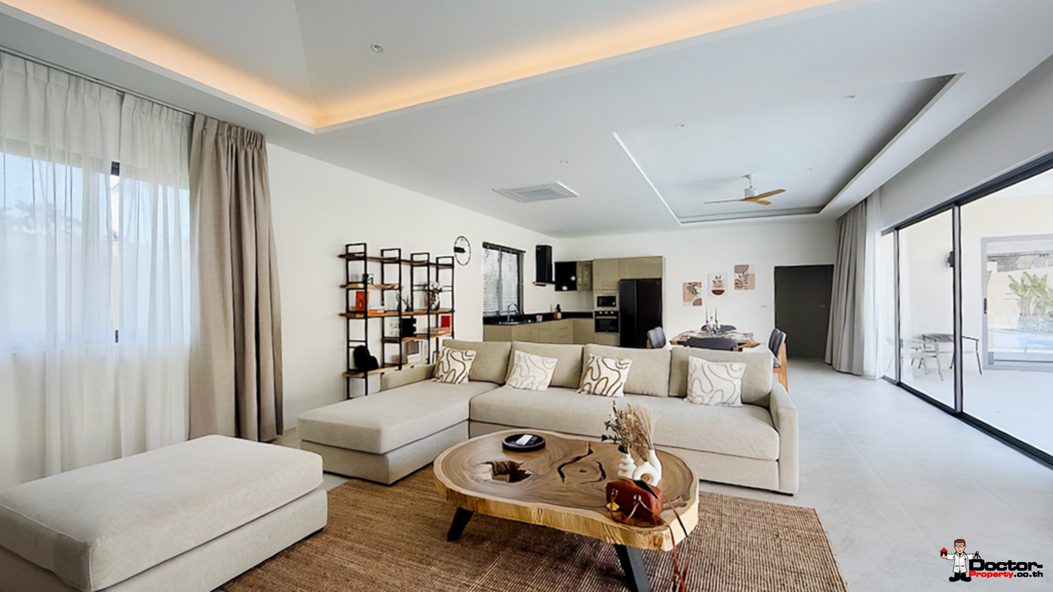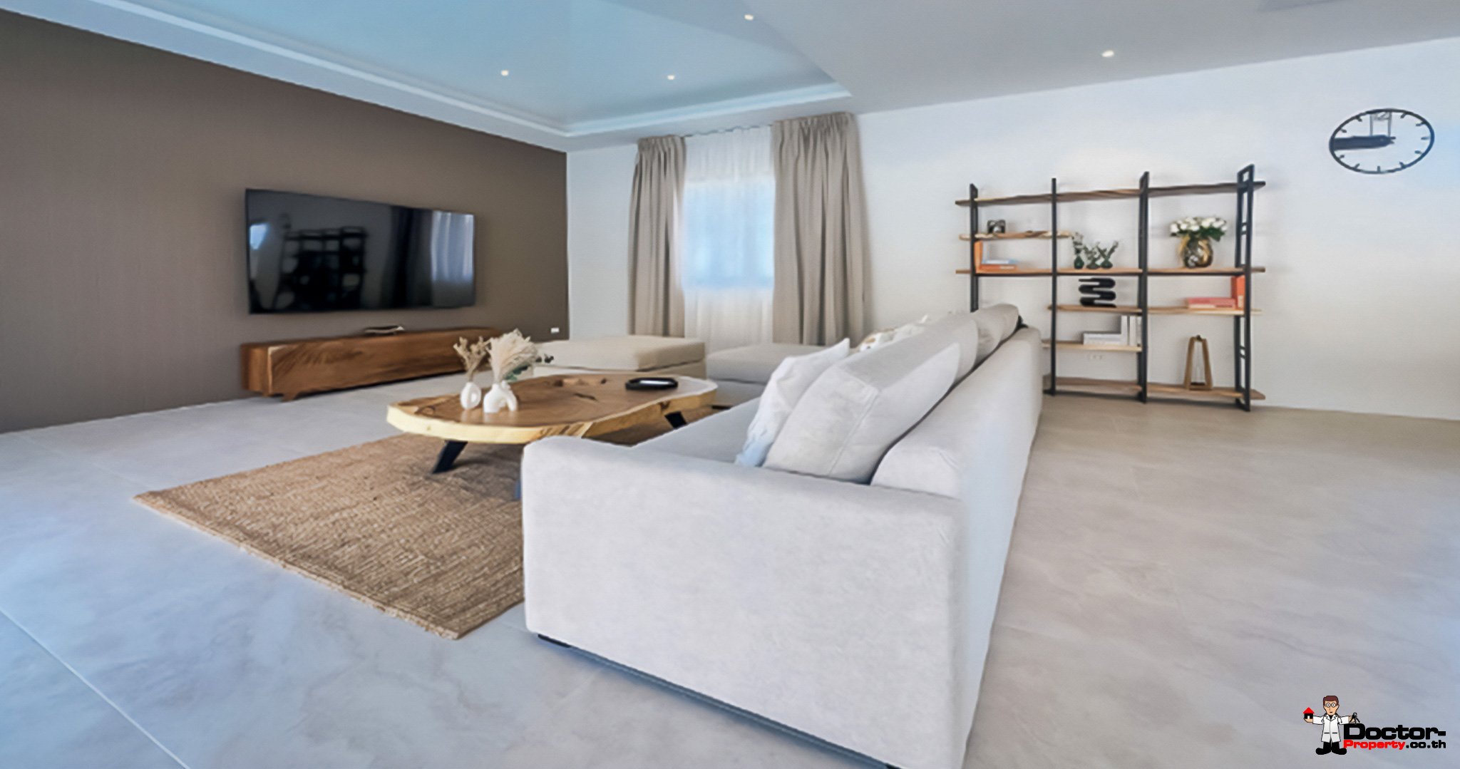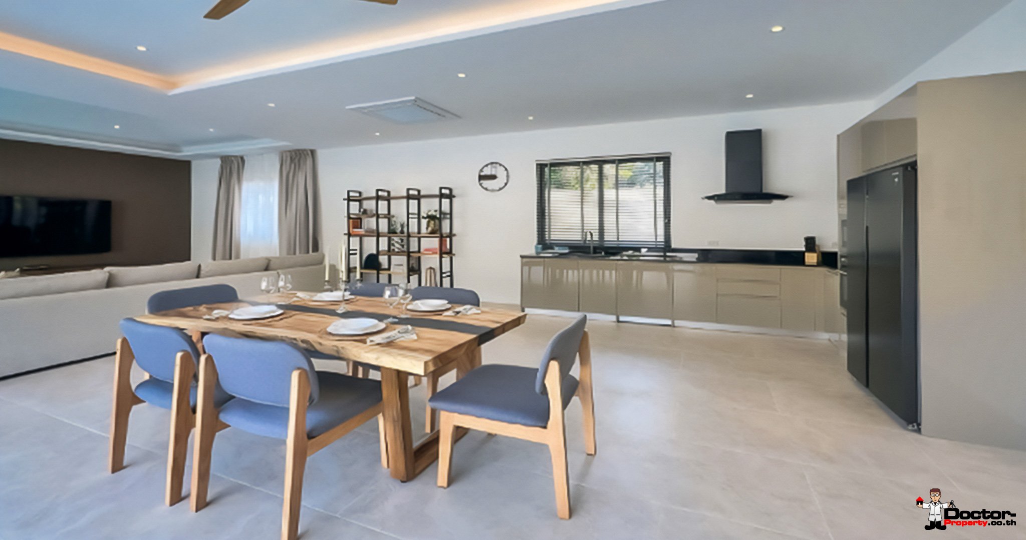 This exquisite tropical villa is thoughtfully designed to combine elegance with functionality. Set on a generous land plot of 650 sqm, the residence boasts a spacious living area of 330 sqm, offering ample room for both relaxation and entertaining. The villa comprises three well-appointed bedrooms, each with its own en-suite bathroom, ensuring privacy and comfort for family members or guests. The property is presented fully furnished. Expansive living and dining areas flow seamlessly to the outdoor terrace, where a private swimming pool is framed by lush tropical landscaping.