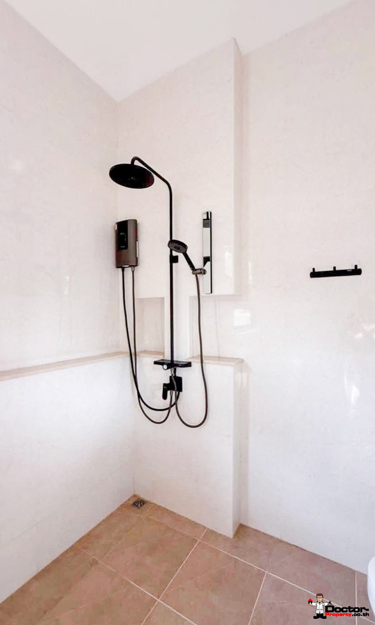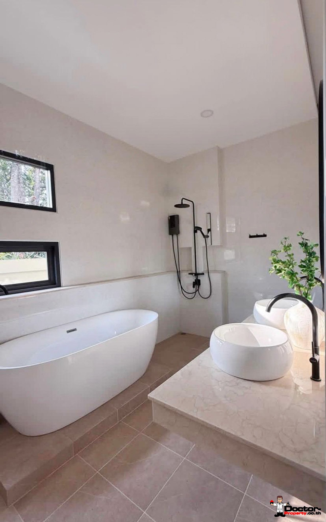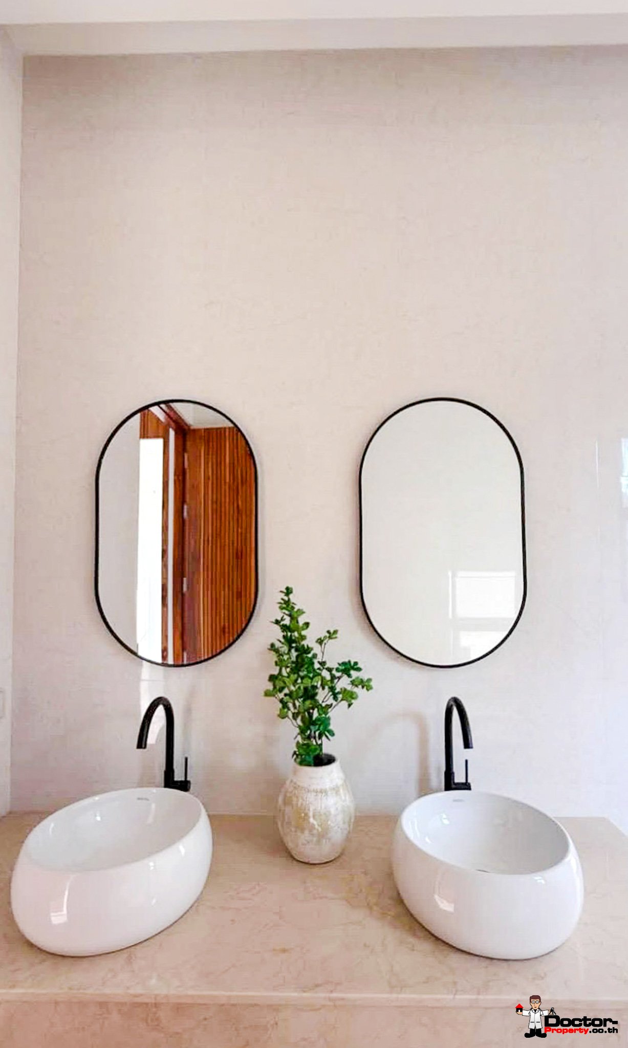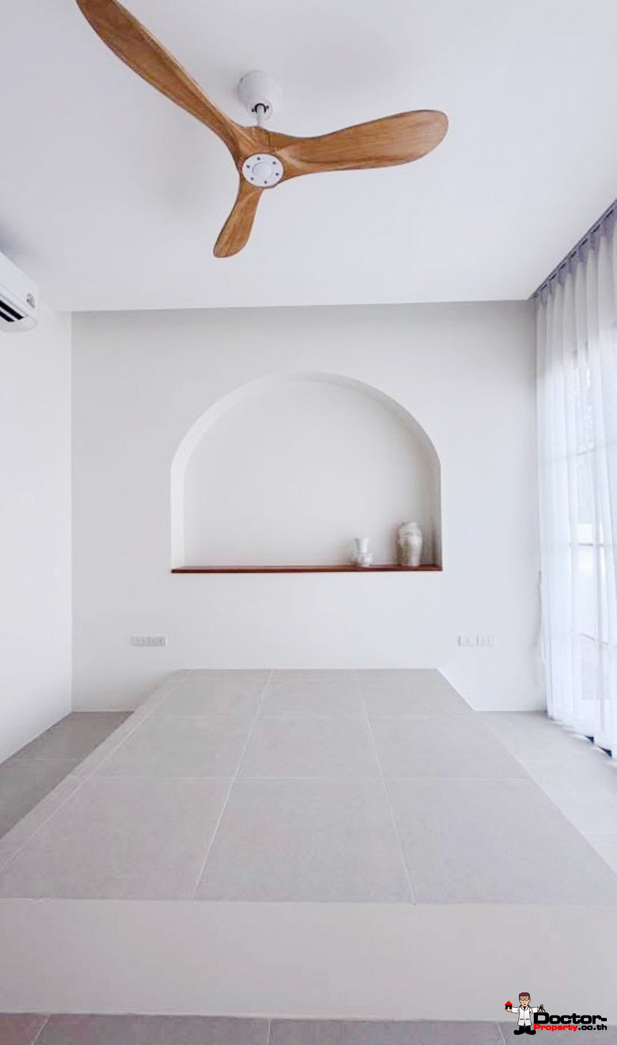 This tropical villa presents an exceptional opportunity to acquire a freehold property in one of the island’s most desirable locations. Set on a land plot of 360 square metres, the residence offers a well-designed building size of 160 square metres, comprising three spacious bedrooms and two modern bathrooms. The interiors are fitted with four air-conditioning units, ensuring comfort throughout the year, while the open-plan living and dining areas create a welcoming environment for both family life and entertaining. Outdoors, the highlight is the private swimming pool measuring 6 by 3 metres, perfectly complemented by a landscaped garden that enhances the villa’s tropical charm. The property is sold with a Thai company, providing a straightforward and secure ownership structure for foreign buyers.