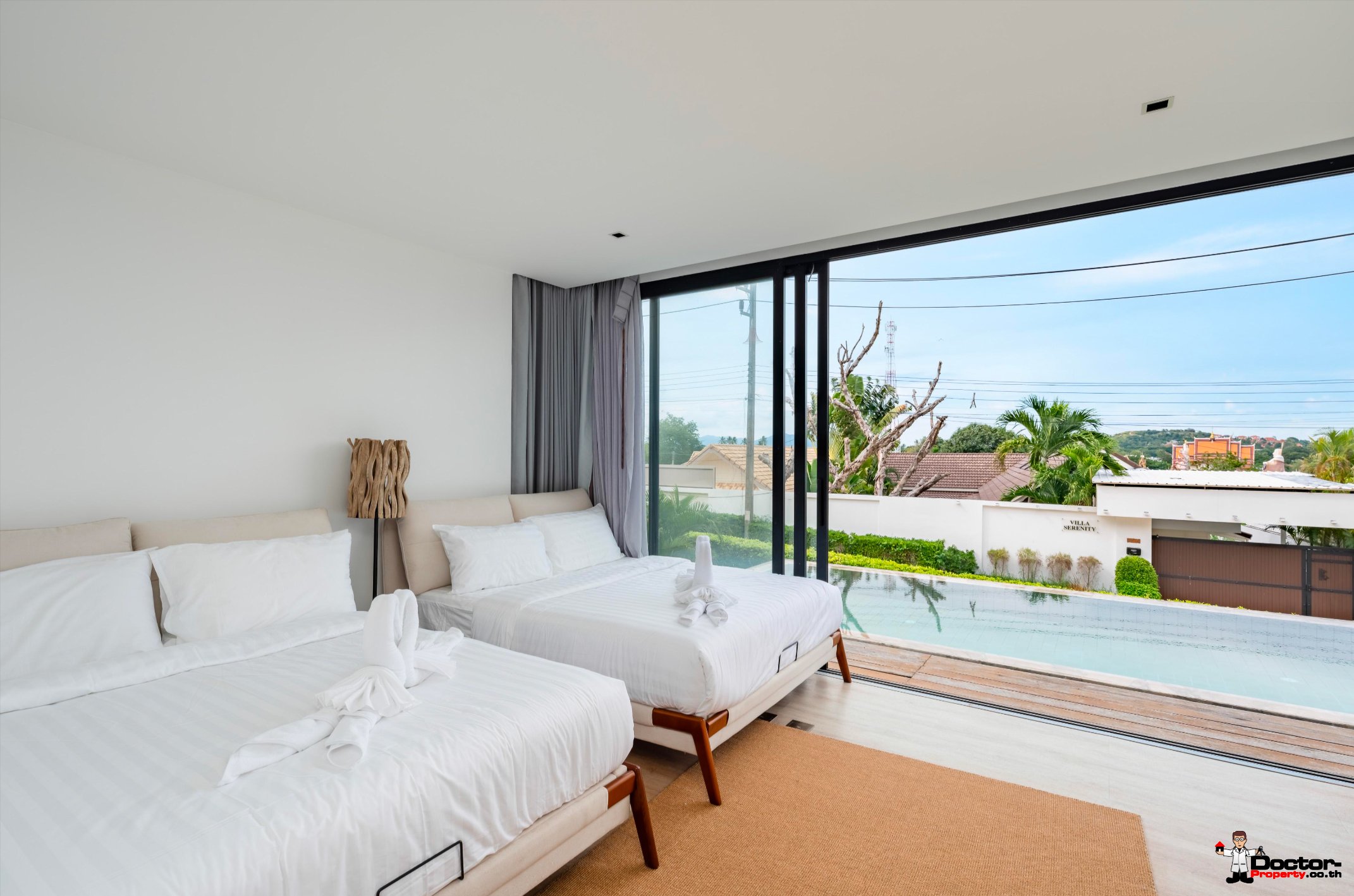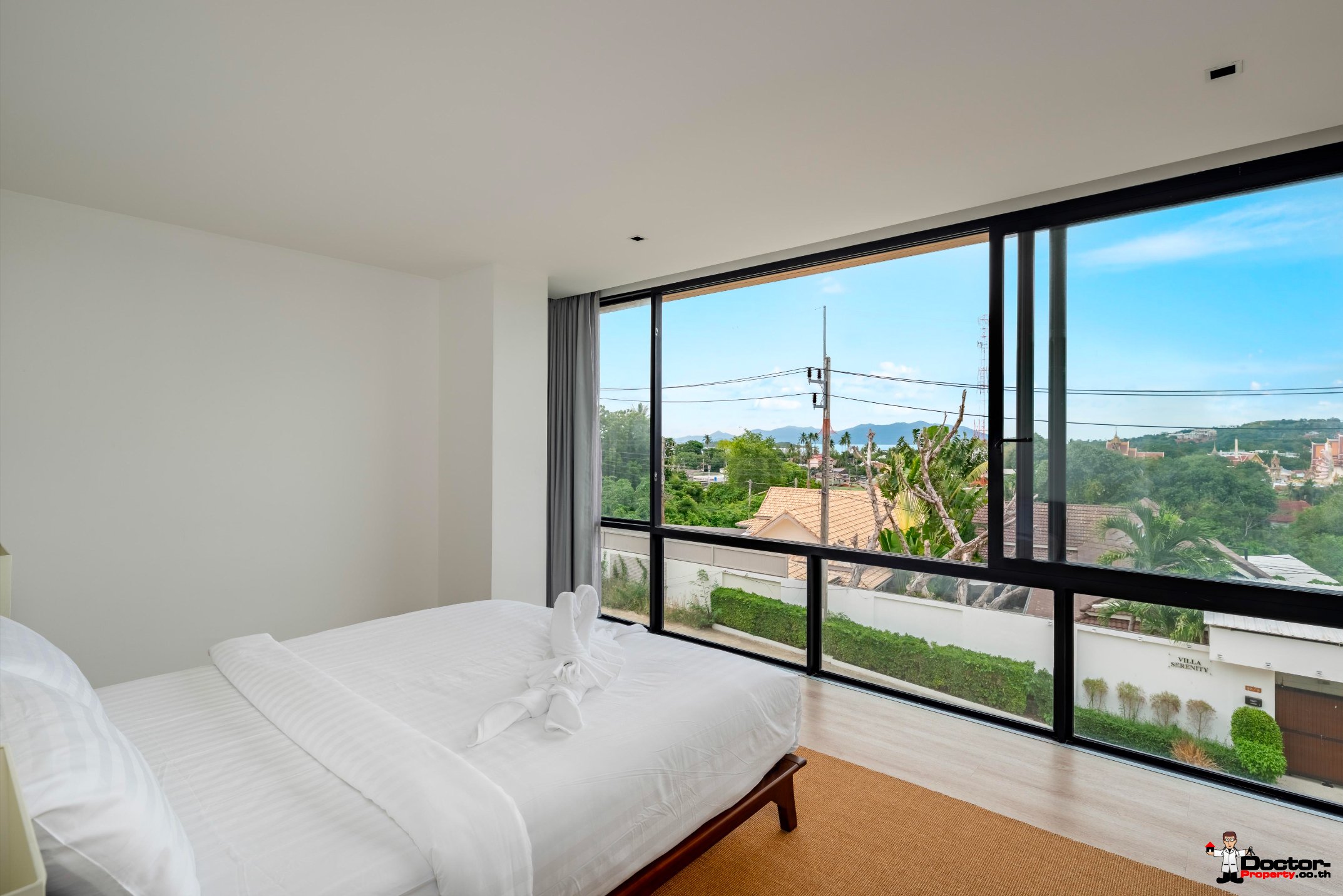 วิลล่าตั้งอยู่บนที่ดินขนาด 425 ตารางเมตร พื้นที่ใช้สอย 433 ตารางเมตร ครอบคลุมสามชั้น ออกแบบมาเพื่อมอบความสะดวกสบายและแสงธรรมชาติอย่างเต็มที่ ห้องนอนกว้างขวางทั้งสี่ห้องสามารถมองเห็นวิวสวนสวยหรือสระว่ายน้ำส่วนตัวอันเงียบสงบ ทุกห้องมีห้องน้ำในตัวและการตกแต่งอย่างประณีต ห้องนอนใหญ่มีระเบียงส่วนตัวที่สามารถมองเห็นวิวทะเลบางส่วนและบรรยากาศอันเงียบสงบ