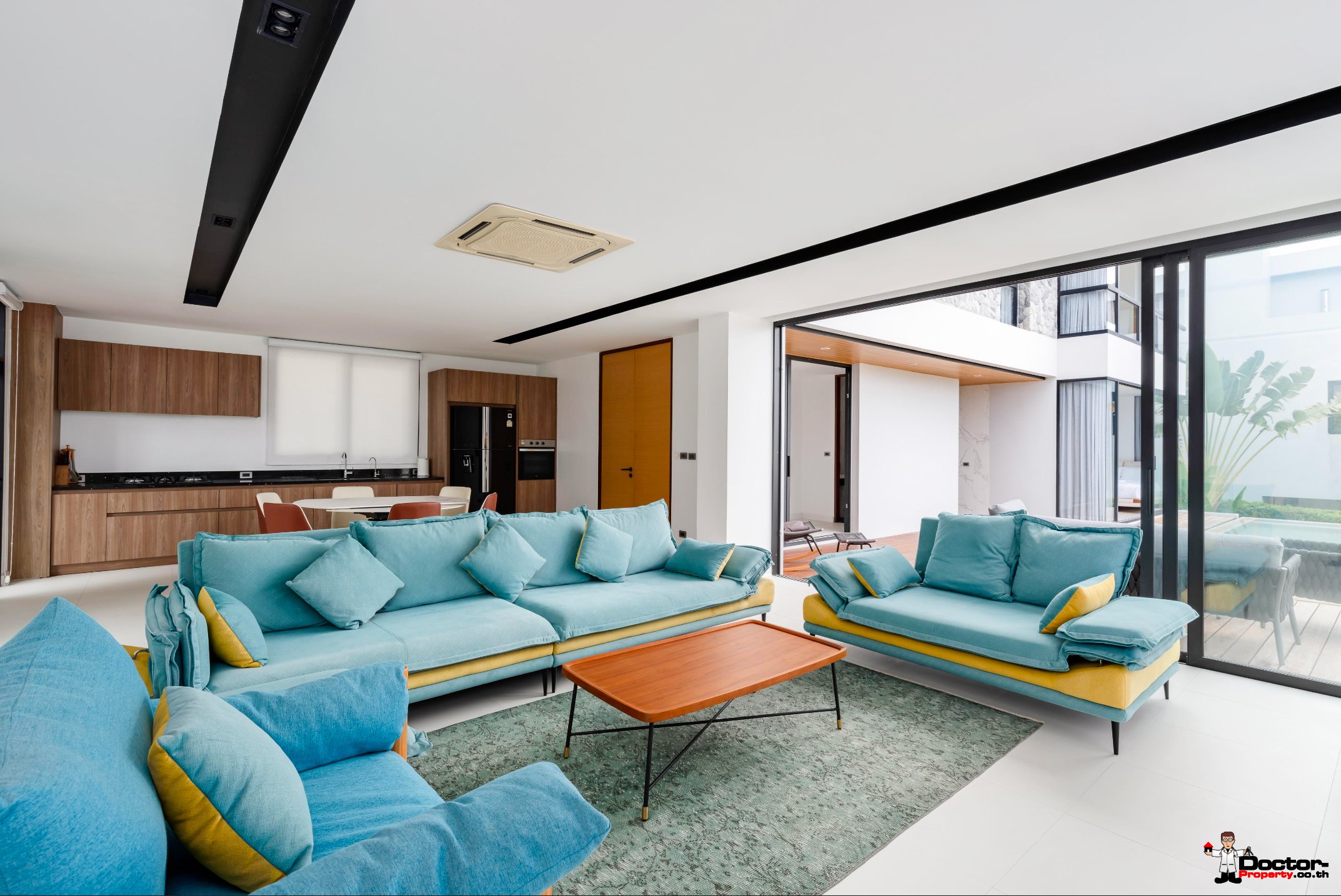 พื้นที่นั่งเล่นและรับประทานอาหารแบบเปิดโล่งเป็นหัวใจสำคัญของบ้าน ด้วยหน้าต่างสูงจากพื้นจรดเพดานที่เปิดรับแสงธรรมชาติอย่างเต็มที่ เชื่อมต่อกับธรรมชาติภายนอกได้อย่างกลมกลืน เฟอร์นิเจอร์ทันสมัยและโทนสีกลางๆ ช่วยเพิ่มความรู้สึกกว้างขวาง ขณะที่ห้องครัวที่เชื่อมต่อกันพร้อมอุปกรณ์ครบครัน ครบครันด้วยเครื่องใช้ไฟฟ้าคุณภาพสูงและพื้นที่เก็บของมากมาย มอบความสะดวกสบายสำหรับทั้งการอยู่อาศัยและความบันเทิง สระว่ายน้ำส่วนตัวของวิลล่าตั้งอยู่กลางแจ้ง โอบล้อมด้วยต้นไม้เขียวขจี มอบความผ่อนคลายอย่างแท้จริง