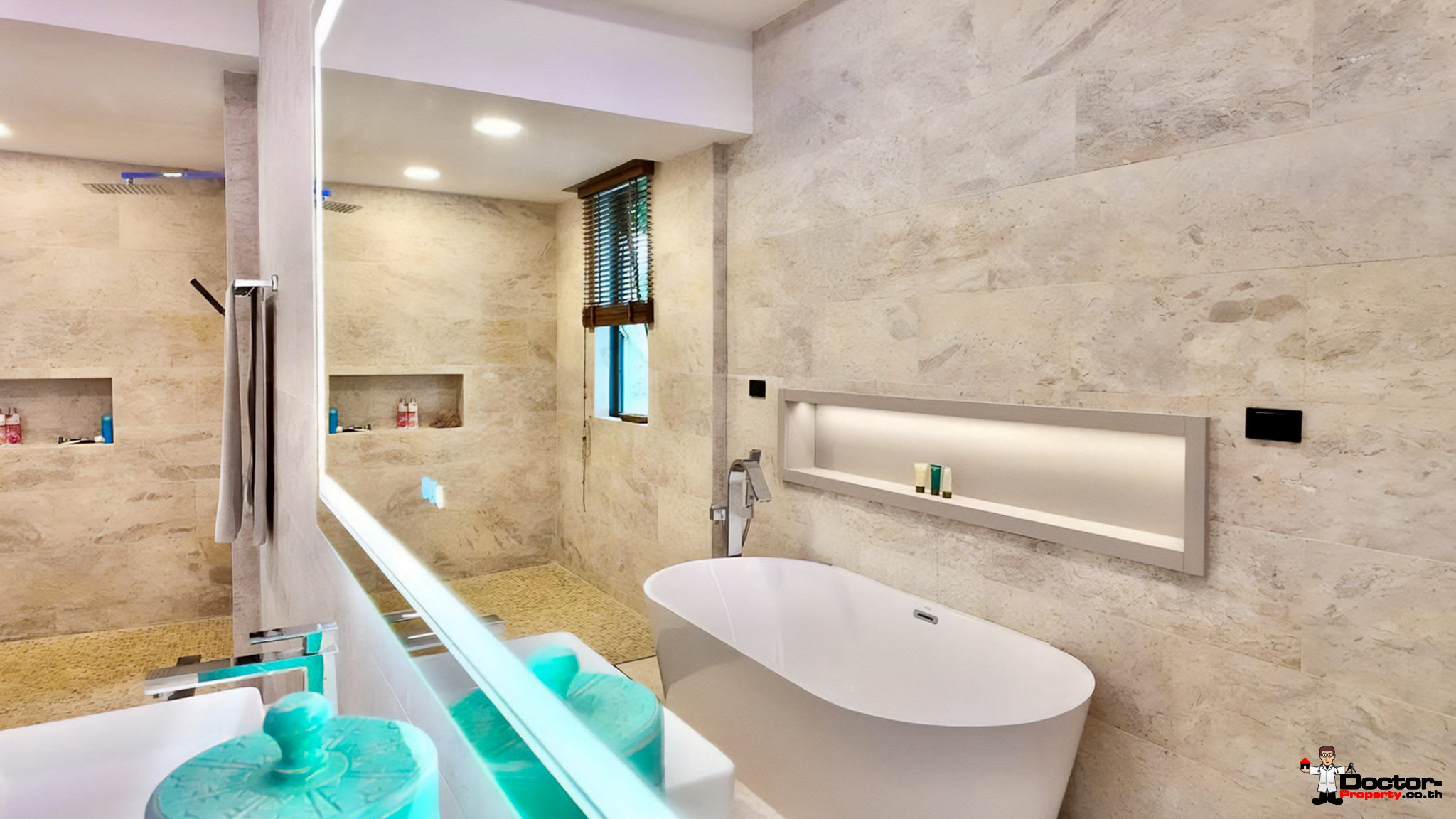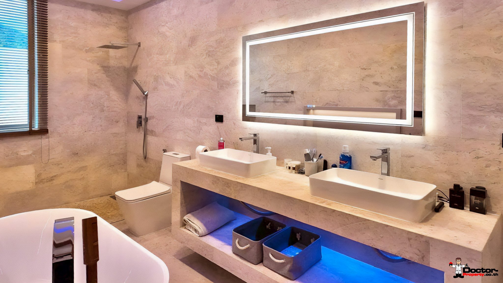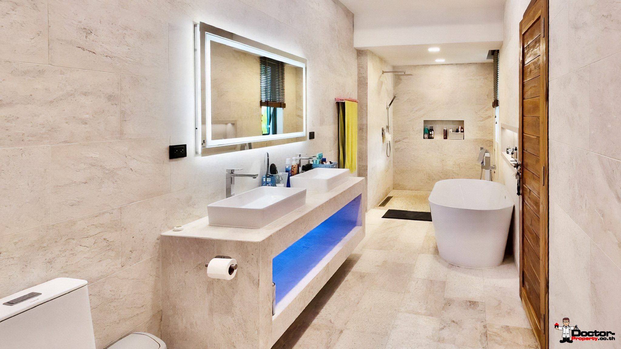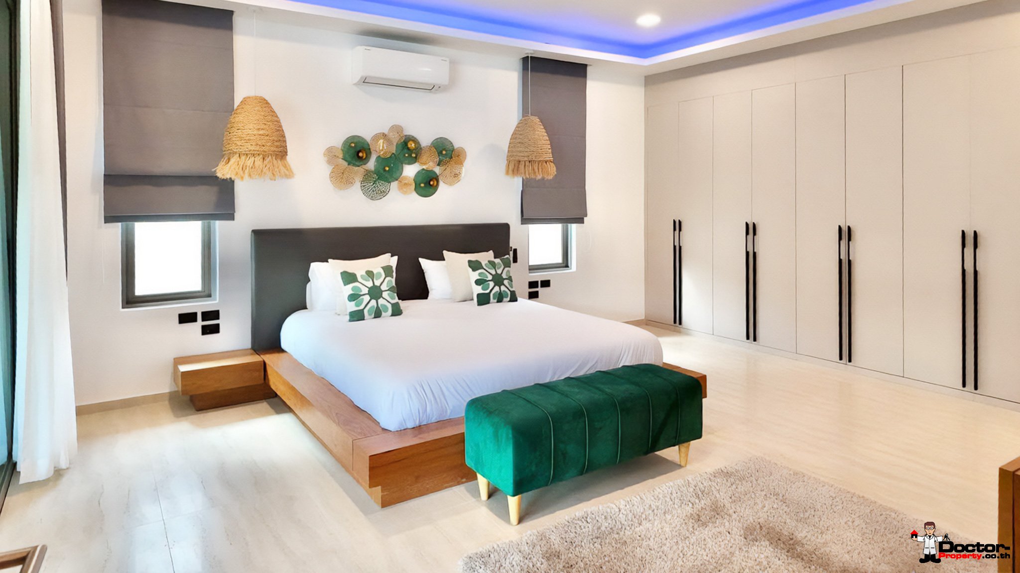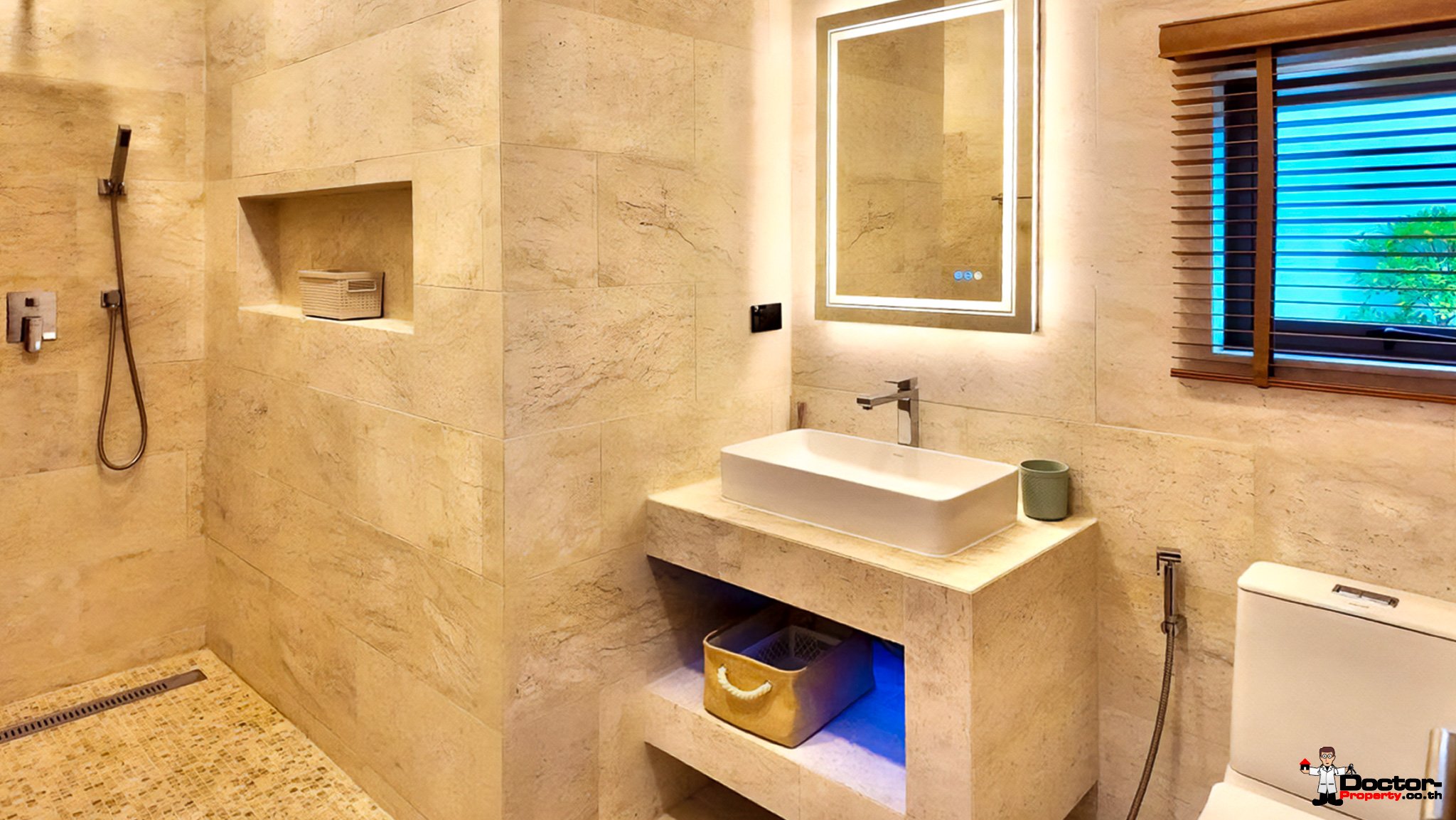 วิลล่าหลังนี้ตั้งอยู่บนพื้นที่กว้างขวาง 930 ตารางเมตร พื้นที่ใช้สอยรวม 510 ตารางเมตร ได้รับการออกแบบอย่างพิถีพิถันเพื่อมอบทั้งความสะดวกสบายและความหรูหรา ประกอบด้วยห้องนอนกว้างขวาง 5 ห้อง แต่ละห้องมีห้องน้ำในตัว และห้องน้ำสำหรับแขกอีก 1 ห้อง เพื่อความเป็นส่วนตัวและความสะดวกสบายสำหรับครอบครัวและผู้มาเยือน การตกแต่งภายในตกแต่งด้วยเฟอร์นิเจอร์ไม้สักและรายละเอียดต่างๆ ครบครัน เสริมด้วยหินทราเวอร์ทีนในห้องน้ำทุกห้องและบนระเบียง มอบความงามอันประณีตแต่ยังคงความเป็นธรรมชาติ ทุกห้องมีตู้เสื้อผ้าแบบบิลท์อินและแบบวอล์กอิน ส่วนห้องนั่งเล่นและห้องรับประทานอาหารแบบเปิดโล่งเชื่อมต่อกับพื้นที่กลางแจ้งได้อย่างกลมกลืน