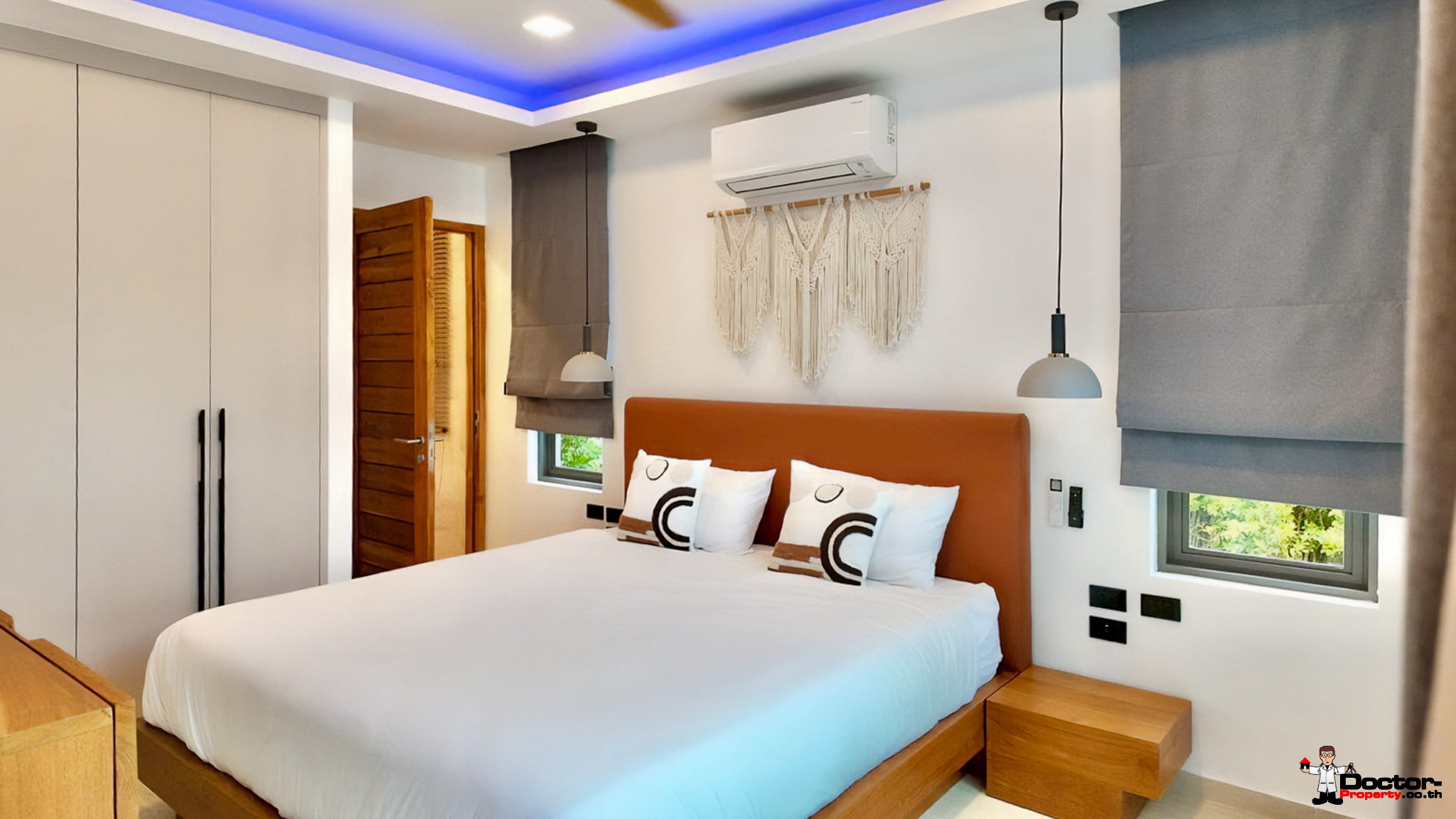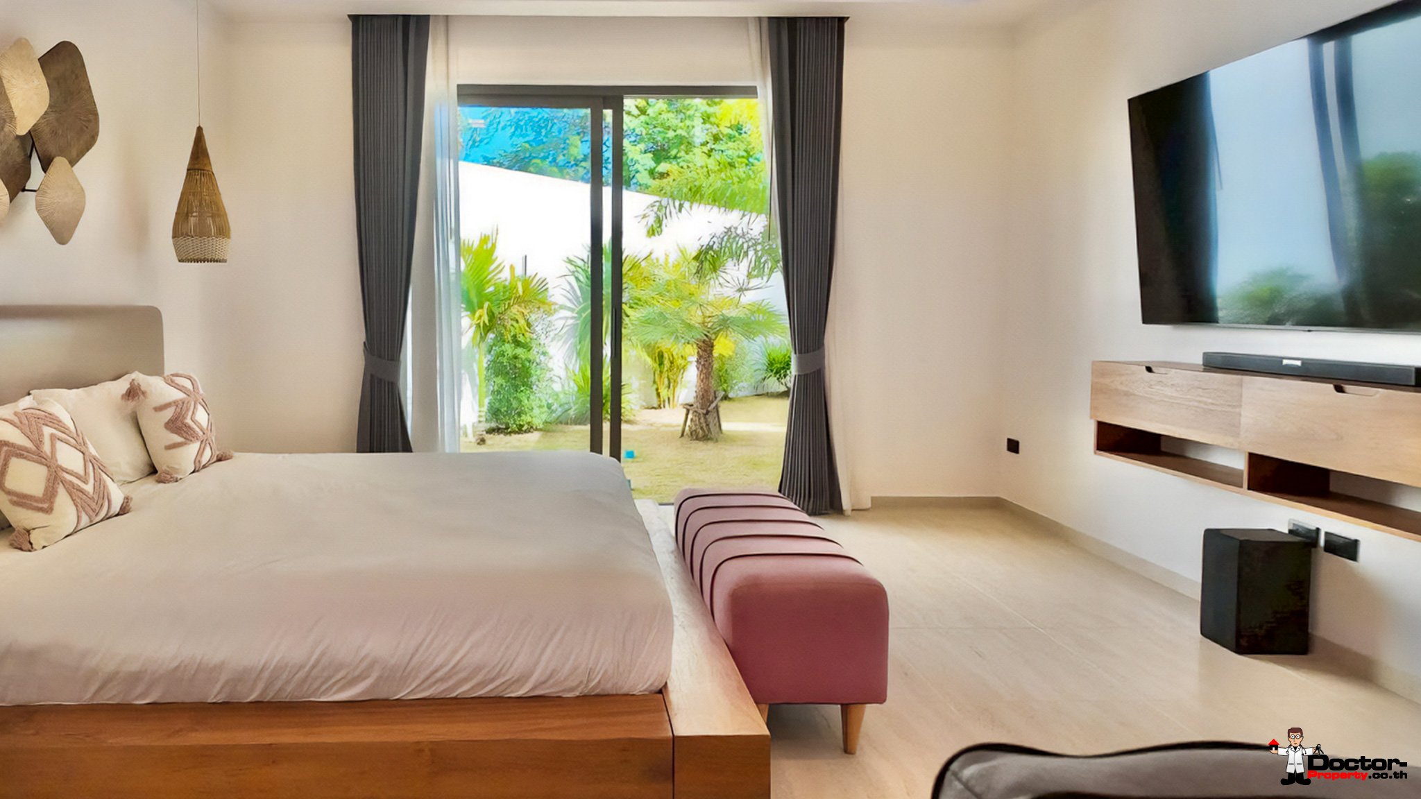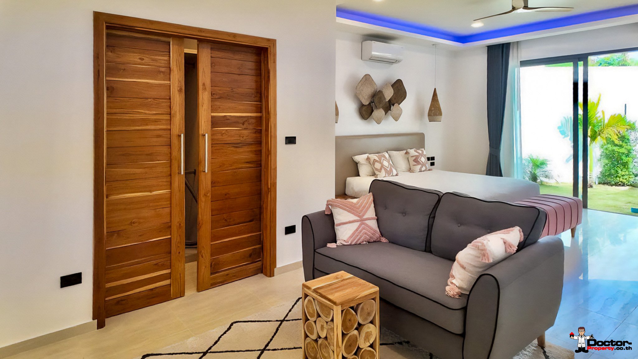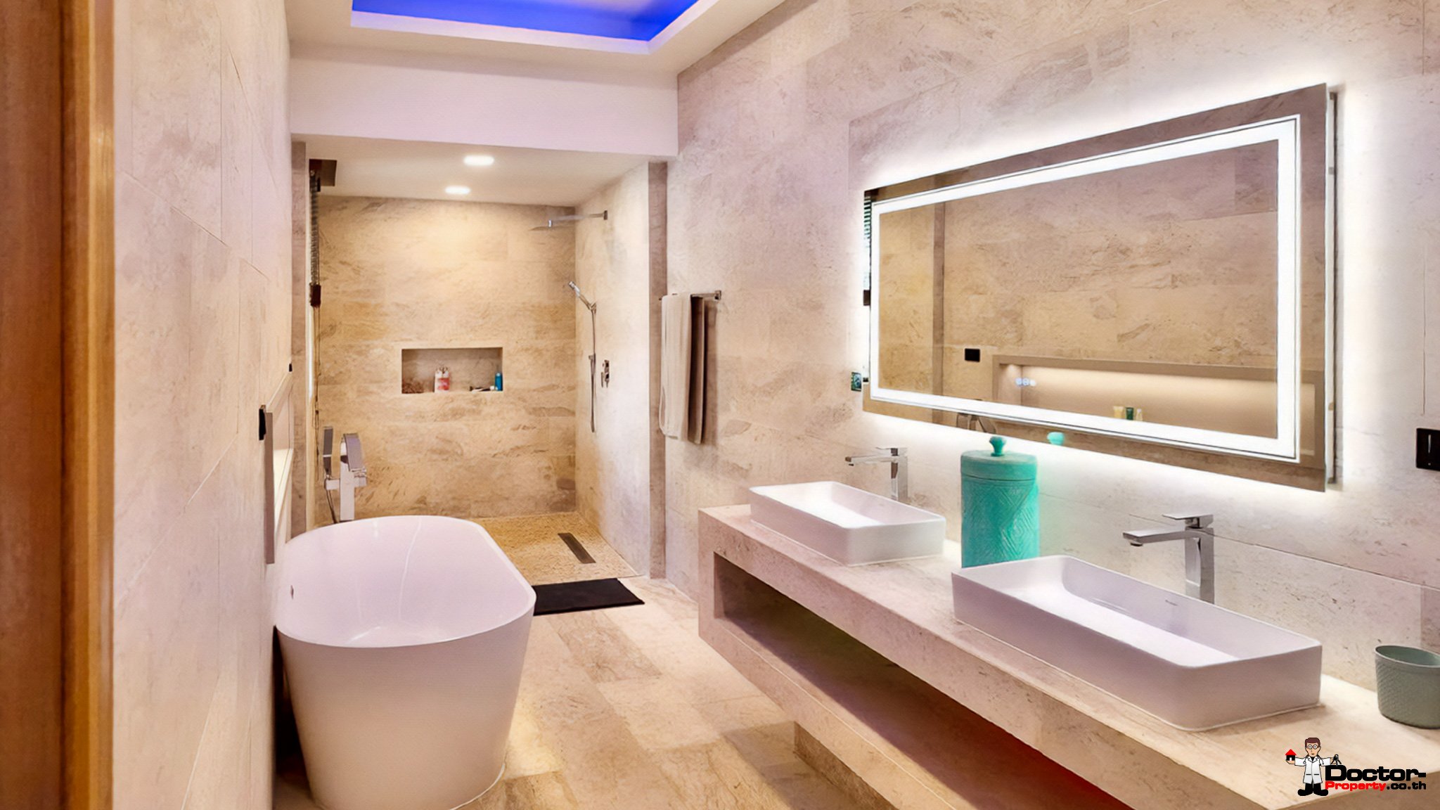 วิลล่าหลังนี้ตั้งอยู่บนพื้นที่กว้างขวาง 930 ตารางเมตร พื้นที่ใช้สอยรวม 510 ตารางเมตร ได้รับการออกแบบอย่างพิถีพิถันเพื่อมอบทั้งความสะดวกสบายและความหรูหรา ประกอบด้วยห้องนอนกว้างขวาง 5 ห้อง แต่ละห้องมีห้องน้ำในตัว และห้องน้ำสำหรับแขกอีก 1 ห้อง เพื่อความเป็นส่วนตัวและความสะดวกสบายสำหรับครอบครัวและผู้มาเยือน การตกแต่งภายในตกแต่งด้วยเฟอร์นิเจอร์ไม้สักและรายละเอียดต่างๆ ครบครัน เสริมด้วยหินทราเวอร์ทีนในห้องน้ำทุกห้องและบนระเบียง มอบความงามอันประณีตแต่ยังคงความเป็นธรรมชาติ ทุกห้องมีตู้เสื้อผ้าแบบบิลท์อินและแบบวอล์กอิน ส่วนห้องนั่งเล่นและห้องรับประทานอาหารแบบเปิดโล่งเชื่อมต่อกับพื้นที่กลางแจ้งได้อย่างกลมกลืน
