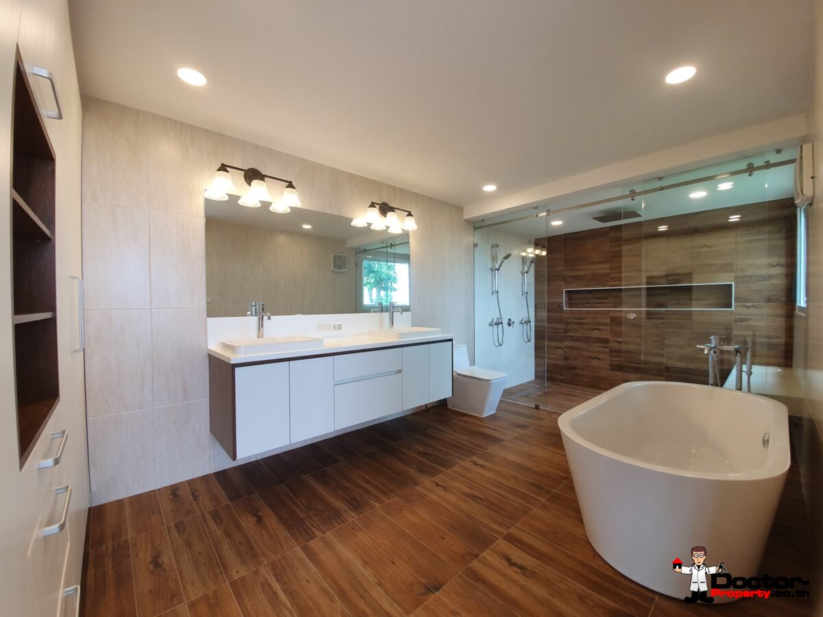 ห้องนอนใหญ่ปรับอากาศพร้อมตู้เสื้อผ้าแบบบิวท์อินที่เปิดสู่ระเบียงขนาดใหญ่ ห้องน้ำในตัวพร้อมอ่างล้างมืออ่างอาบน้ำและฝักบัวอาบน้ำฝน