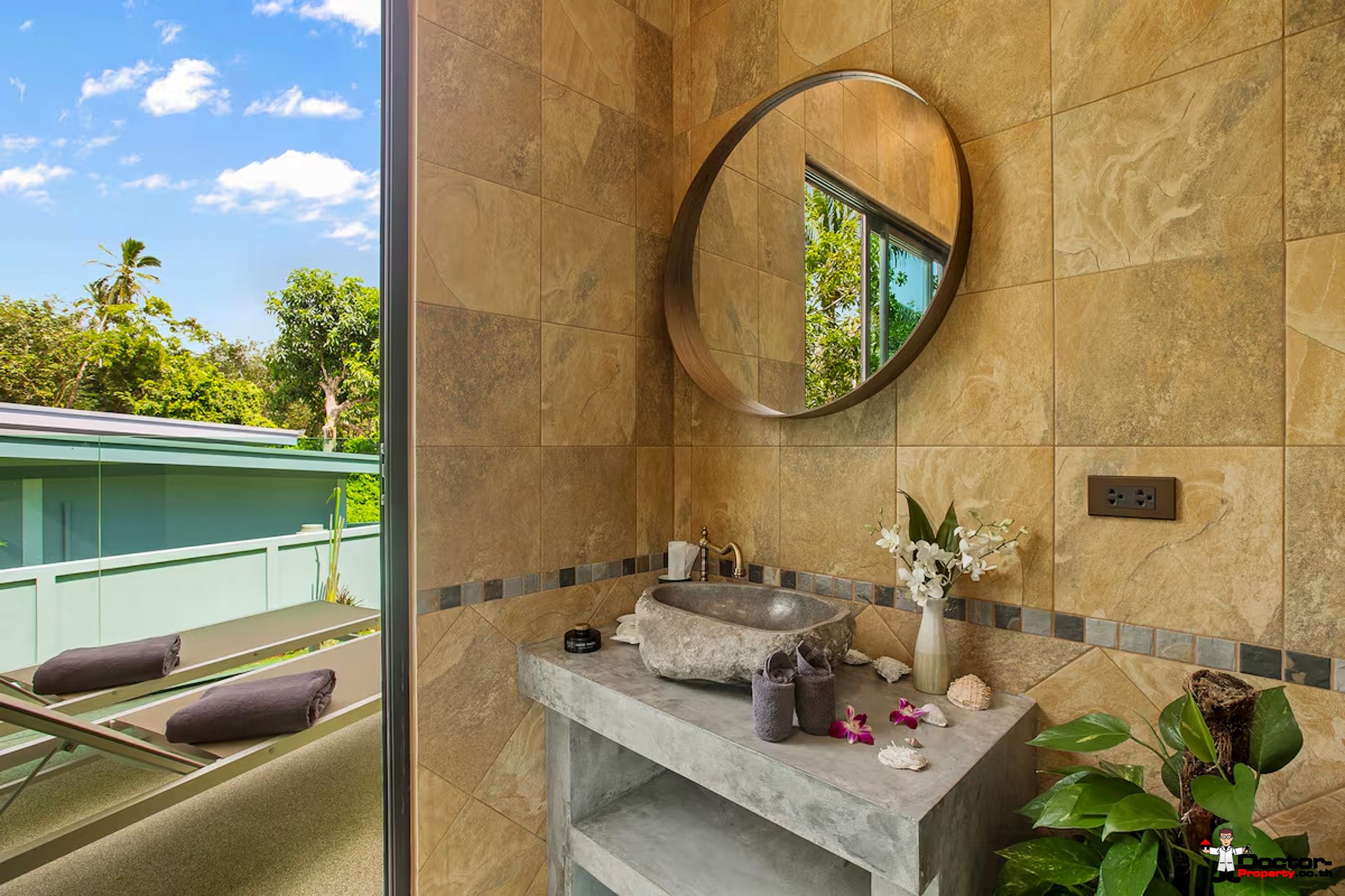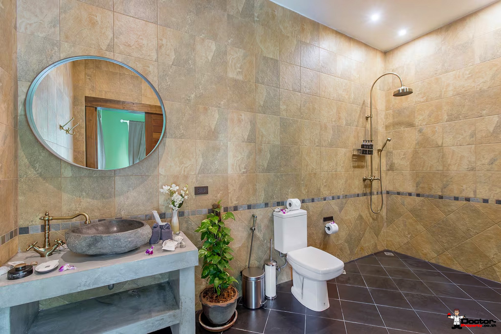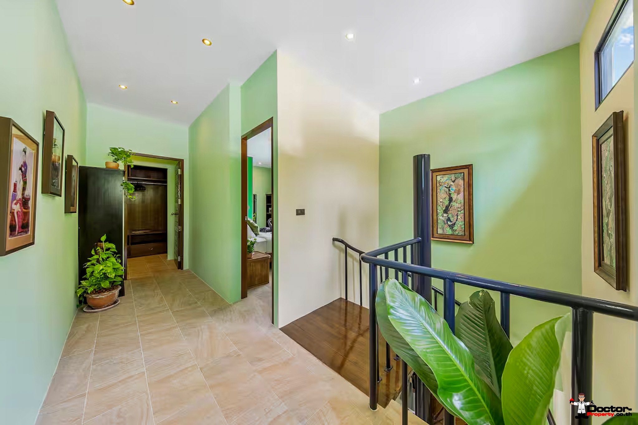 ตั้งอยู่บนที่ดินขนาดใหญ่ 1,216 ตารางเมตร บ้านพักสองชั้นแห่งนี้มีพื้นที่ใช้สอยกว้างขวางถึง 320 ตารางเมตร ให้พื้นที่กว้างขวางสำหรับการใช้ชีวิตแบบครอบครัวหรือการจัดงานเลี้ยงสังสรรค์ วิลล่าประกอบด้วยห้องนอนที่ตกแต่งอย่างดี 4 ห้อง และห้องน้ำหลายห้อง ออกแบบมาเพื่อความสะดวกสบายและประโยชน์ใช้สอยสูงสุด ใจกลางของที่พักคือสระว่ายน้ำส่วนตัว ล้อมรอบด้วยสวนภูมิทัศน์และระเบียงอาบแดด สร้างบรรยากาศอันเงียบสงบสำหรับการพักผ่อน พื้นที่นั่งเล่นและรับประทานอาหารแบบเปิดโล่ง เสริมด้วยห้องครัวทันสมัย ​​พร้อมหน้าต่างบานใหญ่และประตูบานเลื่อนที่เปิดรับแสงธรรมชาติและลมเย็นสบายทั่วทั้งบ้าน ผังบ้านสองชั้นให้ความรู้สึกกว้างขวางและเป็นส่วนตัว พร้อมระเบียงชั้นบนที่มองเห็นทัศนียภาพของธรรมชาติเขตร้อน