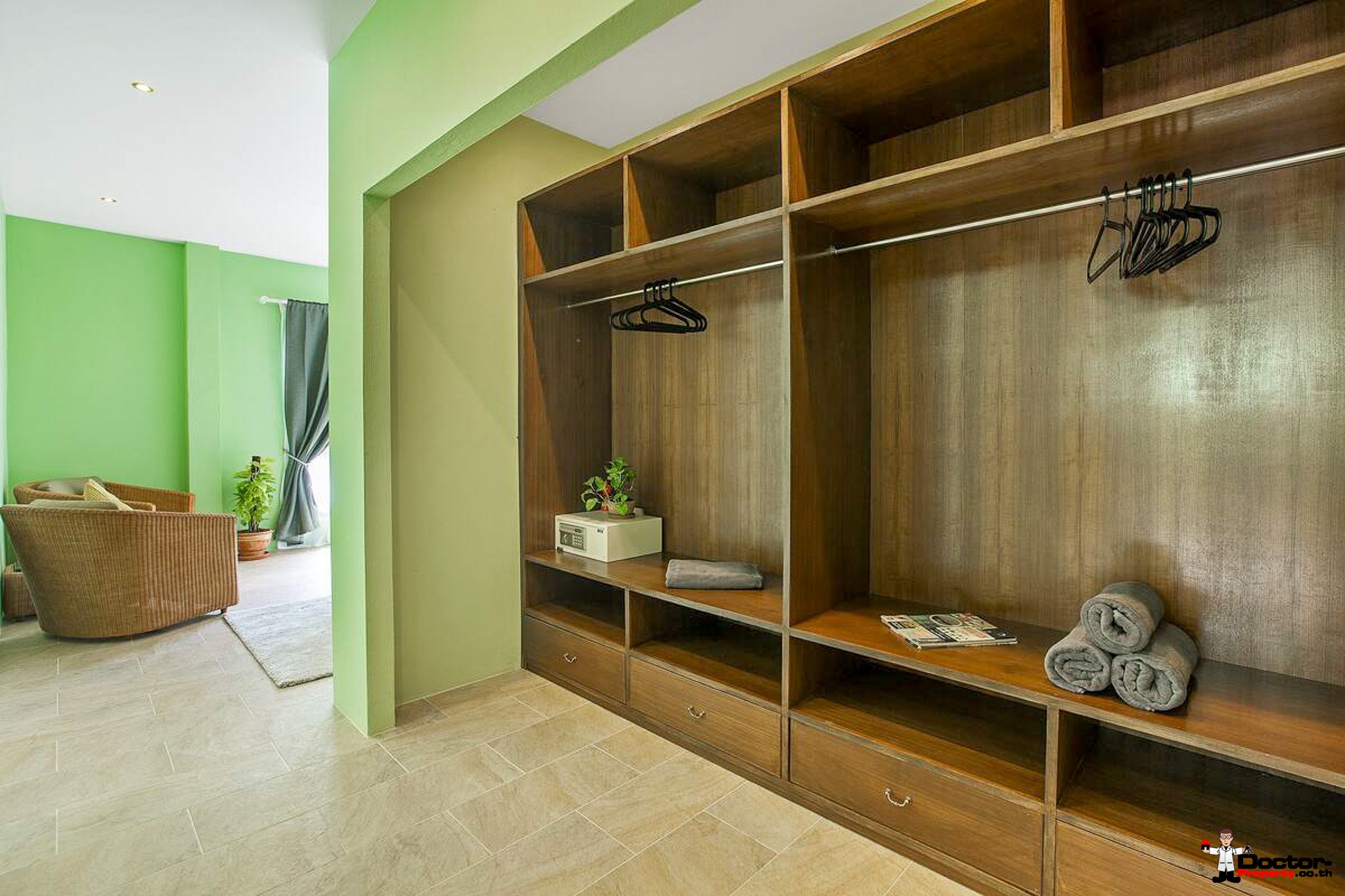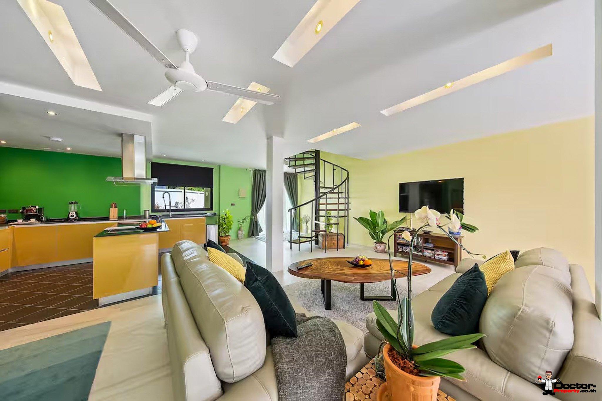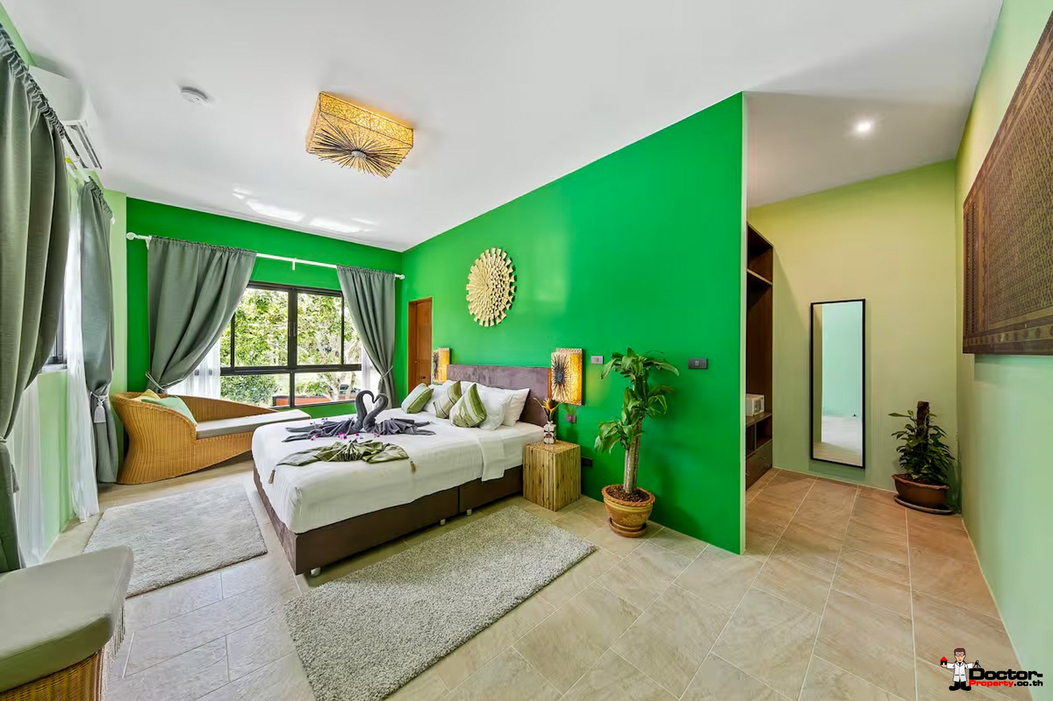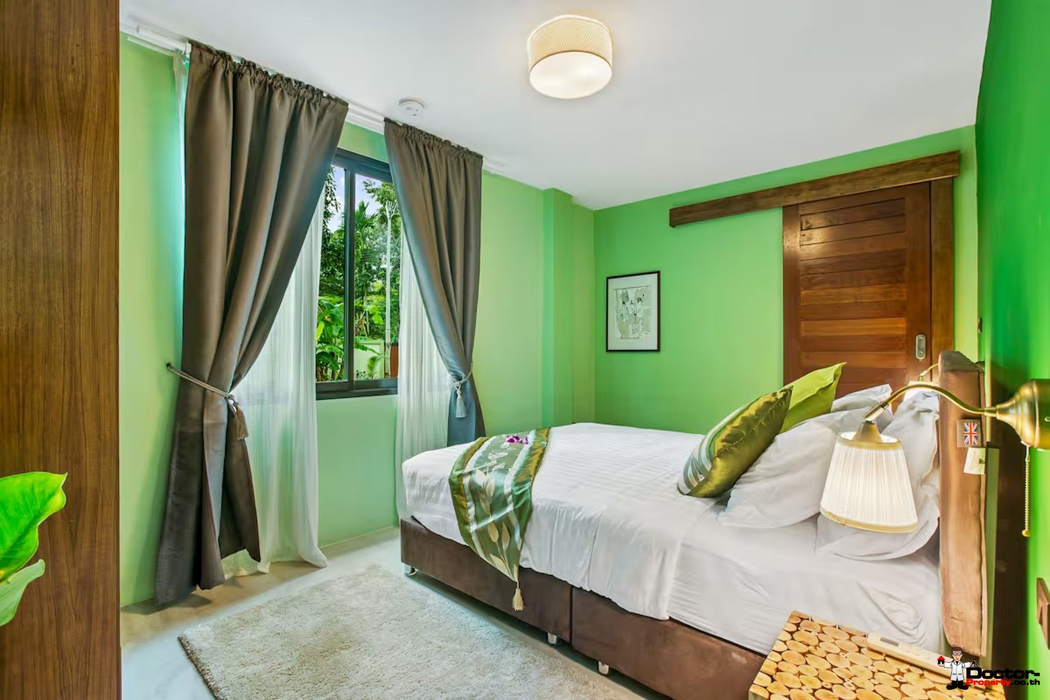 ตั้งอยู่บนที่ดินขนาดใหญ่ 1,216 ตารางเมตร บ้านพักสองชั้นแห่งนี้มีพื้นที่ใช้สอยกว้างขวางถึง 320 ตารางเมตร ให้พื้นที่กว้างขวางสำหรับการใช้ชีวิตแบบครอบครัวหรือการจัดงานเลี้ยงสังสรรค์ วิลล่าประกอบด้วยห้องนอนที่ตกแต่งอย่างดี 4 ห้อง และห้องน้ำหลายห้อง ออกแบบมาเพื่อความสะดวกสบายและประโยชน์ใช้สอยสูงสุด ใจกลางของที่พักคือสระว่ายน้ำส่วนตัว ล้อมรอบด้วยสวนภูมิทัศน์และระเบียงอาบแดด สร้างบรรยากาศอันเงียบสงบสำหรับการพักผ่อน พื้นที่นั่งเล่นและรับประทานอาหารแบบเปิดโล่ง เสริมด้วยห้องครัวทันสมัย ​​พร้อมหน้าต่างบานใหญ่และประตูบานเลื่อนที่เปิดรับแสงธรรมชาติและลมเย็นสบายทั่วทั้งบ้าน ผังบ้านสองชั้นให้ความรู้สึกกว้างขวางและเป็นส่วนตัว พร้อมระเบียงชั้นบนที่มองเห็นทัศนียภาพของธรรมชาติเขตร้อน